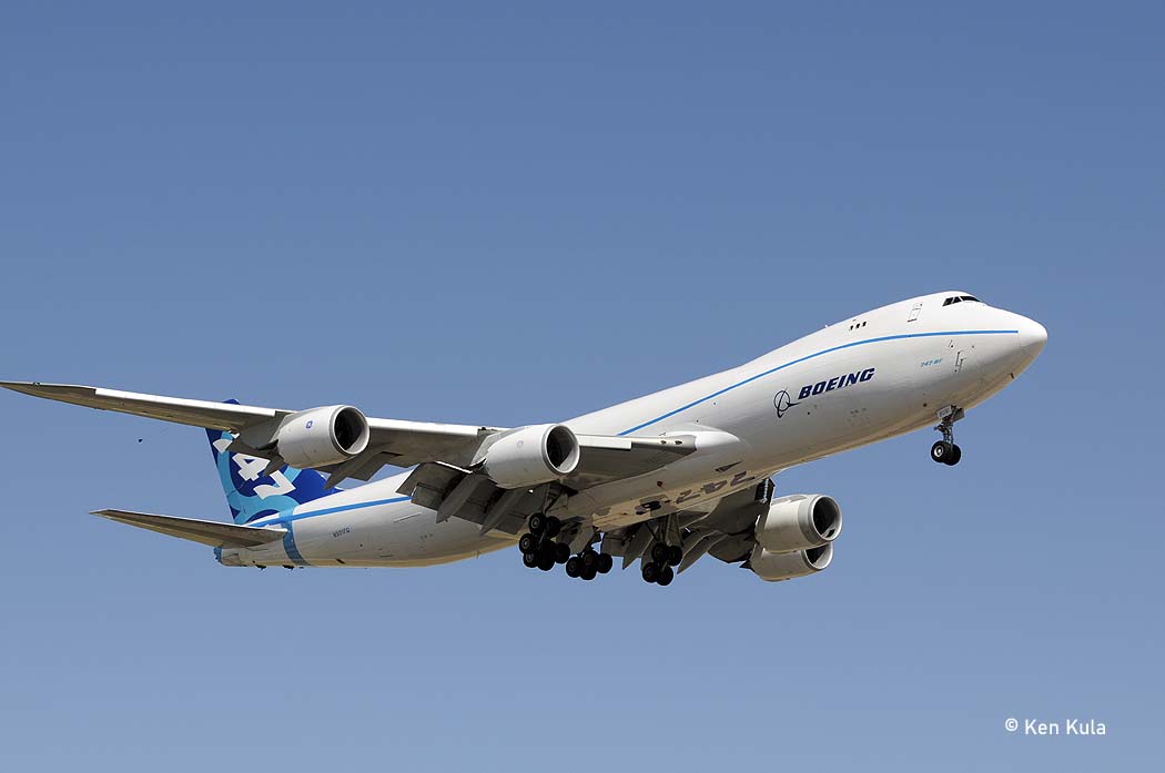 Boeing B-747-8F at Yuma Arizona, note the black air sensor trailing wire behind the tail Story by Ken Kula, photos by Del Laughery, Corey Beitler, Don Linn and Ken Kula Boeing’s final two series of their 747 model fell...