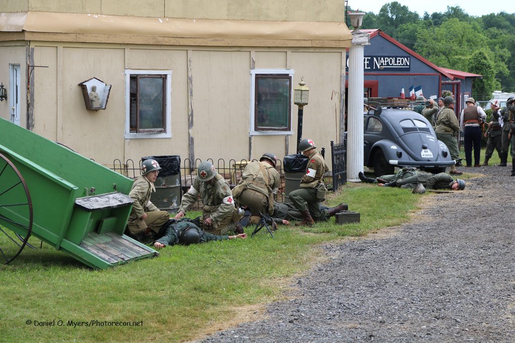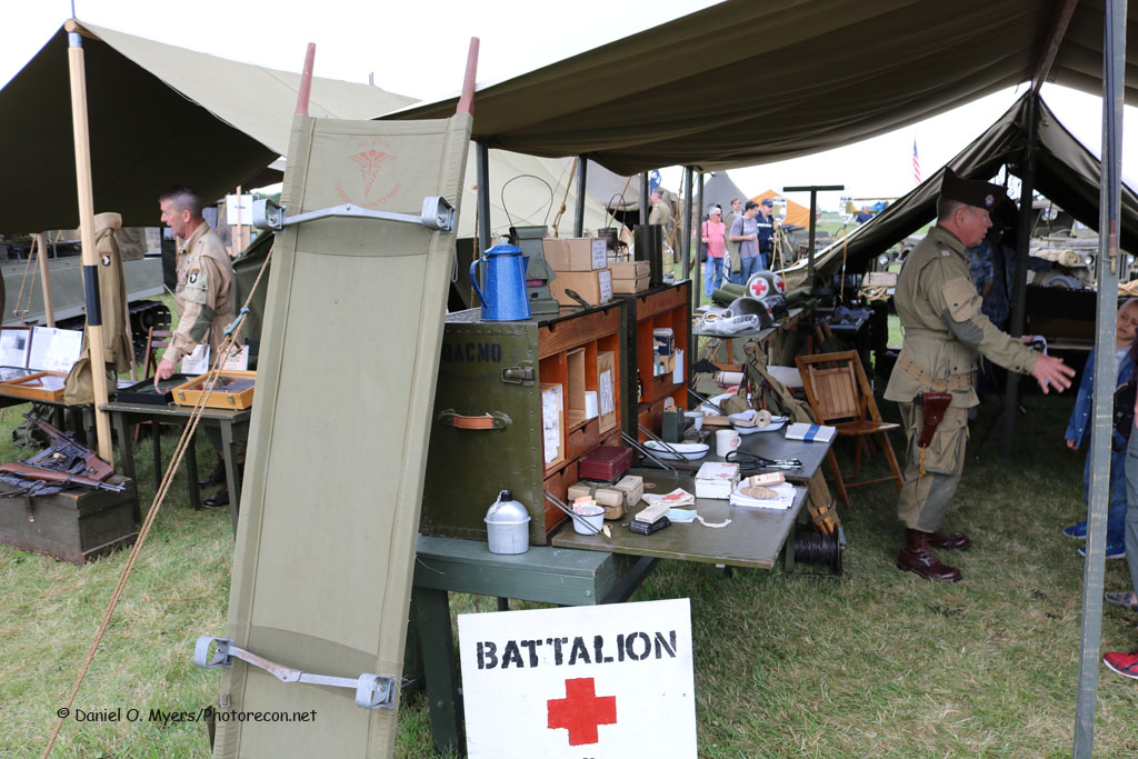 Following a battle, casualties were first taken to a Battalion Aid Station. Safely located near the front lines- these stations treated, stabilized and moved the patient out as quickly as possible. Time was critical! Within the Reading encampment, weekend visitors were able to chat with a real doctor inside a recreated WWII Battalion Station. Dr. Moody, from Harrisburg Hospital, exhibited a tent stocked full of medical items and instruments from his own personal collection including plasma- the most important element in first aid which was first kept on ice then later a dry base that was mixed with water. Dr. Moody explained the most valued person in an Aid Station was a seasoned medic that could recognize and know how to remedy a patient’s situation, even better than a new doctor. And, always listen to the nurses!! In a fluid battle, Battalion Stations were sometimes overrun by the enemy. In many of those situations, there was respect among the American and German doctors that were known to bring their captives to each other’s respective Aid Station or even care for the other side’s wounded. Once the patient was stabilized, they were sent along to a Collection Aid Station.
