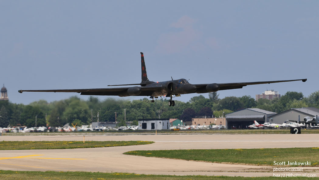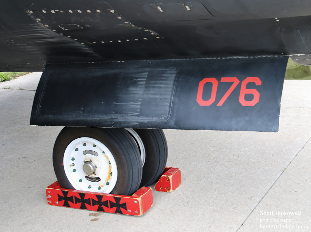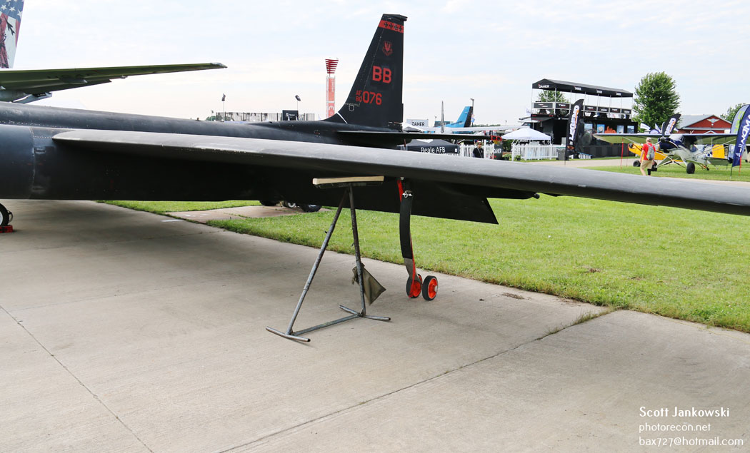 Accompanying the aircraft on landing is a chase car driven by a fellow U-2 pilot who assists the flying pilot by calling out the aircraft’s altitude. Once the aircraft has descended to an altitude of 2 feet above the runway, the flying pilot initiates the stall, and the aircraft basically falls to the runway. This is vital as the landing gear is not designed to absorb the weight of the aircraft if it falls from much above 2 feet. Instead of the typical tricycle landing gear the U-2 uses a bicycle configuration with a forward set of wheels located just behind the cockpit and the rear set of wheels located behind the engine. The rear wheels are coupled to the rudder to provide steering while the aircraft is taxiing. To maintain balance while the aircraft is taxiing a set of “pogos” (auxiliary wheels) are attached under the wings. These are inserted into sockets, mid-way along with wings and fall off during takeoff, also the wing tips have titanium skids to protect them during landing. After the U-2 comes to a stop the pogos are re-installed prior to the aircraft taxing back to parking.