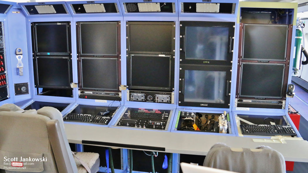 The aircraft carries a twelve-person crew with most missions lasting approximately six to eight hours. The interior of the aircraft is separated into 4 sections which contain a bank of computer servers and 3 sections of flight test engineer workstations. Upon entering the aircraft through the L1 door (due to its shortened fuselage the 747SP only has 4 entry doors) if you turn left, you will find a few rows of the original seats and the original Korean Airlines artwork on the forward bulkhead. You will also find the stairs to the upper deck and also the flight deck, which is located in the 747SP’s distinctive hump a feature found on all versions of the 747. The flight deck contains five seats, with the flight crew coordinating and collaborating with all the other crew members to evaluate and make decisions related to feasibility, sequence, and choice of engine tests to be conducted.