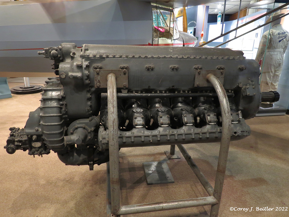 Advancements in regular aero engines also doomed the development of the Continental XI-1430. Aero engines had matured with advancements in technology and standard designs were developing nearly the same power-to-weight ratios as desired by the “hyper engines”. Manufacturers of large bombers chose to use radial, air-cooled engines in most of their designs, which were cheaper to build and less susceptible to overheating and combat damage than high-performance, water-cooled, inline engines. Improvements in conventional streamlining also lessened the need for compact, high-performance aero engines. The XI-1430 was also heavier than comparable models. As a result, interest in the XI-1430 diminished. Continental Motors only built 23 examples of the XI-1430. The museum’s example of this incredibly rare aero engine is displayed in an unrestored state. The engine was donated to the museum by the Swathmore School District. Although how Swathmore School District acquired the engine is unknown, it’s most likely the engine was sold as surplus or donated to the school district to be used for instructional purposes.