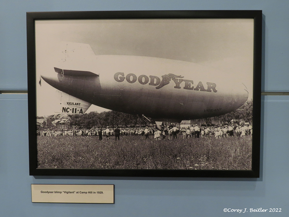Finally, a series of old aviation photographs are displayed on the wall behind the exhibit. The photographs showcase some of the historic aviation moments in Pennsylvania. Most of the photographs date from the 1920s and early 1930s, and were taken in the Central Pennsylvania area. One of the notable photographs in the collection showcases the opening of a new terminal at the Harrisburg Airport in 1935. Another photograph depicts a very early Goodyear Blimp visiting the town of Camp Hill in 1929. Finally, a photograph shows the first Los Angeles to New York airmail flight in a Ford Trimotor aircraft stopping for fuel and to unload mail at the Harrisburg State Airport in October 1930.