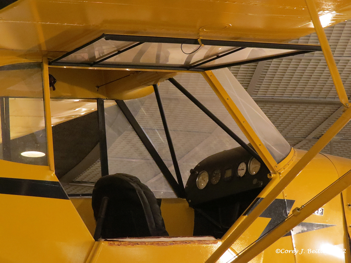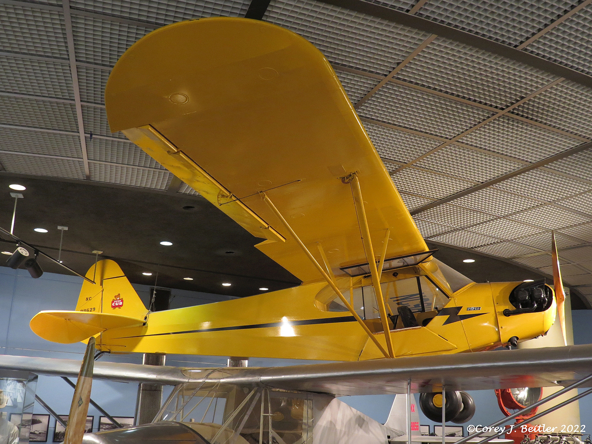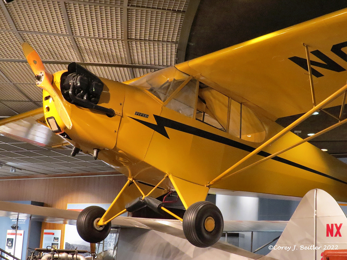 Hanging above the exhibit is a restored Piper J-3 Cub. Built by Piper Aircraft first in Bradford, then in Lock Haven, Pennsylvania, the J-3 Cub is one of the most iconic light aircraft in aviation history. The Cub had a simple, but sturdy, lightweight design that gave it good short-field performance and low-speed flying qualities. Initially designed as a training aircraft, the Cub found use in a variety of military roles during World War II such as artillery spotting and ground control. Over 20,000 Cubs were built in the United States and many are still flying today. The iconic J-3 Cub is also the official state airplane of Pennsylvania. The restored Cub on display is painted in the classic bright yellow color known as “Cub Yellow” or “Lock Haven Yellow”. Including the Cub in the exhibit honors the important impact the aircraft had not only on the aviation history of Pennsylvania but also the United States and the world.