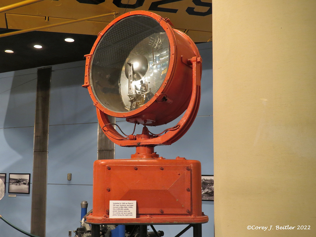Another interesting artifact that is part of the exhibit is a large beacon light. The beacon light on display was installed in 1925 on Penn’s Hill near Sunbury. In 1926, the light was moved to Mile High. Rated at 2,000,000 candle-power, this beacon light was one of a series installed throughout the United States during the 1920s. The purpose of these beacons was to guide pilots flying the night airmail routes. Concrete arrows were also installed on the ground throughout the country to help guide pilots visually during the day. As technology such as radio communication and radar modernized the aviation industry, these beacon lights slowly disappeared, and today, very few survive. In some remote areas of the Western United States, some of the concrete arrows that guided airmail pilots across the empty landscape many years ago still exist, though many have been lost to development or the elements.