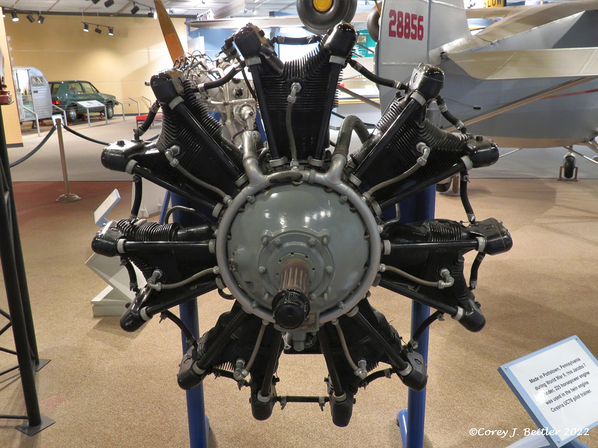 Another engine on display is a Jacobs seven-cylinder radial engine. Unlike inline engines, radial engines rely on air to keep them running at operating temperature rather than water. The Jacobs Aircraft Engine Company became famous for producing excellent radial engines in the 200-400 horsepower range that were reliable and affordable to operate. The engine on display was manufactured in Pottstown during World War II and rated at 225-horsepower. This engine, designated the R-755 by the military and the L-4 by the company, was first run in 1933 and was still in production in the 1970s. The R-755 was used in a variety of aircraft during the 1930s and 1940s including the Beech Model 17 Staggerwing, Cessna AT-17 Bobcat, the Boeing-Stearman PT-18 Kaydet, and the postwar Cessna 195 civil aircraft.