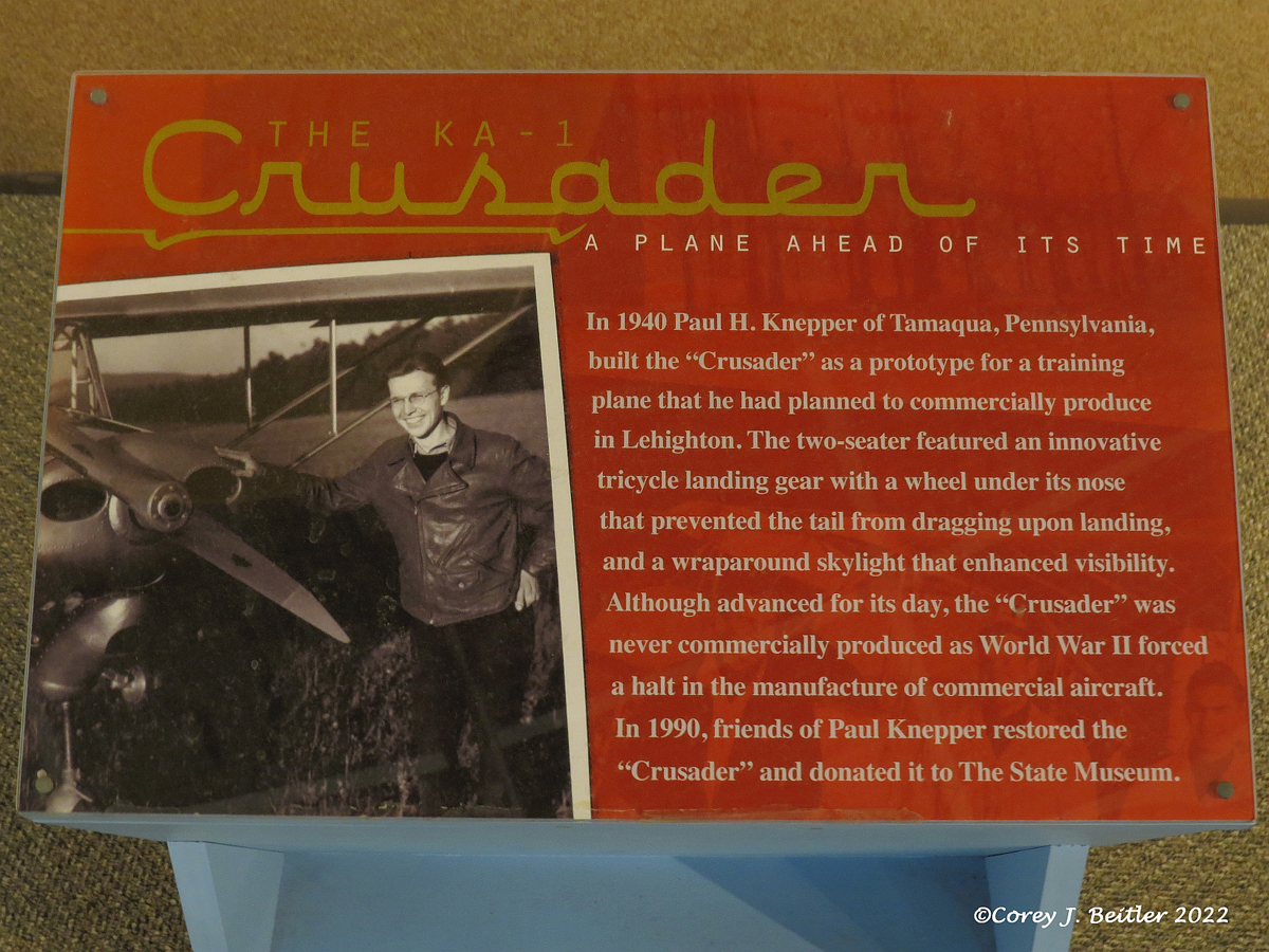 After the war ended, Knepper never pursued mass-producing and marketing of the KA-1 Crusader. For many years, the prototype was stored in a barn at Knepper’s farm. After Knepper died in 1989, his wife Ruth donated the aircraft to the State Museum of Pennsylvania. Friends of Knepper, some who worked with him on building the plane originally, fully restored the aircraft for Mrs. Knepper before she donated it to the museum as a tribute to their friend and his efforts to design his own airplane. The State Museum of Pennsylvania took possession of the restored KA-1 Crusader for its collection in 1991. On display with the KA-1 are two photographs of the hangar where the airplane was assembled and Knepper’s coveralls, still stained with work grease and oil, from when he was working on perfecting his airplane.