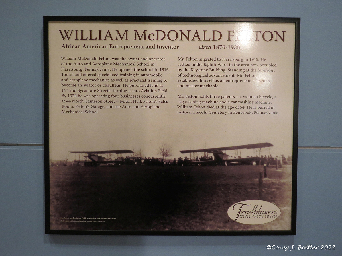 The final piece of the aviation exhibit is a small plaque on the wall honoring William McDonald Felton. Felton was an African American entrepreneur and inventor who in 1916, opened an aviation and automobile mechanics school, and later, a practical aviation school. He purchased land in Harrisburg at 14th and Sycamore Streets, turning it into Aviation Field to train pilots. The plaque honors Felton’s contributions and shows a photograph of pilots completing their flight training at Aviation Field in 1920.