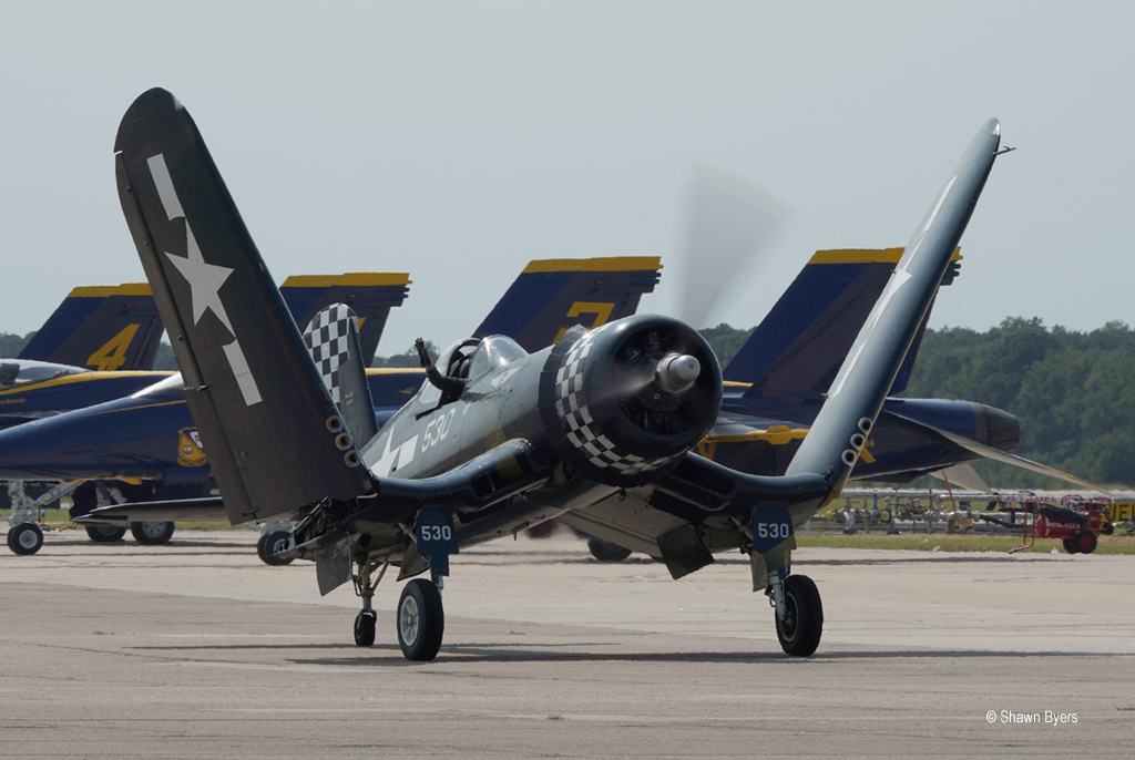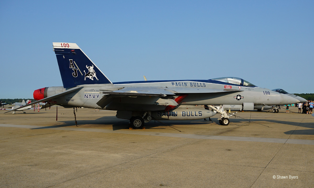 Additional statics at this end were a 7th Fighter Training Squadron T-38 Aggressor in blue from Langley Air Force Base, a T-6 Texan II, a Skyraider and Wildcat from the Military Aircraft Museum down the road and a PT-19. A VFC-12 Super Hornet from the “Omars” was close by on the hot ramp but did not fly.
