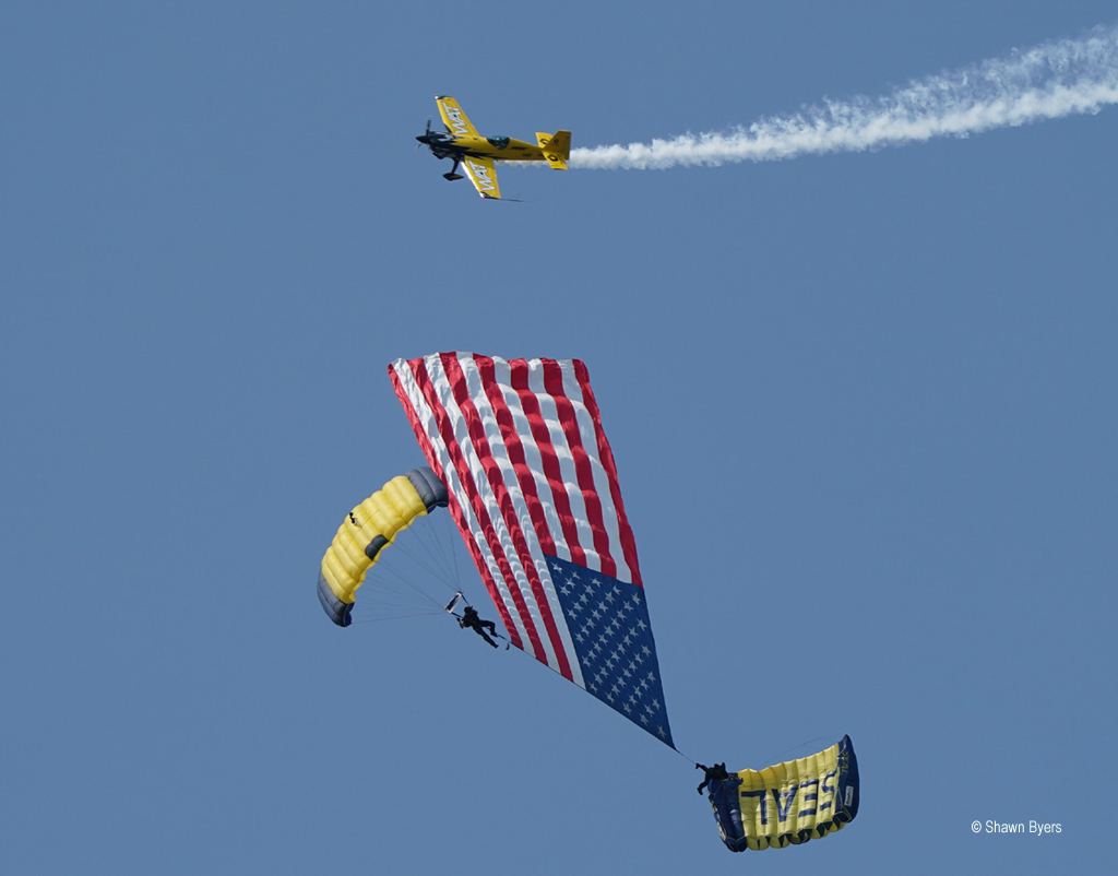 The flying started at 1000 on Oceana’s Runway 05R/23L. Morning sun is excellent starting behind and slightly to the right. The first aircraft airborne was a CH-53 from the Sea Dragons of HM-12 with two groups of jumpers aboard. A traditional salute to veterans features motorcycles of the Patriot Guard and Corvettes that ride from the west end ramp to show center. Then the Navy’s Leap Frogs opened the show with the flag jump. A second jump with the Explosive Ordnance Disposal Team took place utilizing very different and much larger canopies. On Sunday, the Leap Frogs delivered the flag vertically between two jumpers, only breaking off at about 200 feet. They performed an afternoon jump too and suffered an actual chute failure. All landed safely.