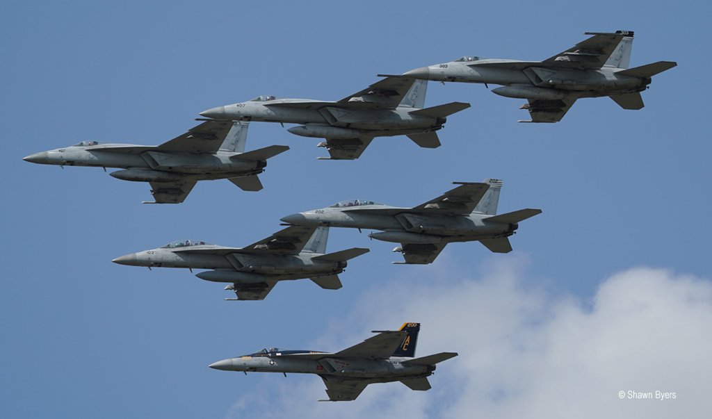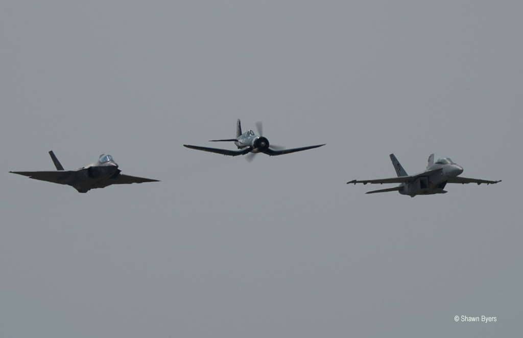 The Fleet Airpower Demonstration begins with a head-to-head engagement of two Hornets. One is designated as the aggressor, which is soon gunned down in a horizontal, circling fight. Another set appears and engages in a vertical fight with the same result. When the skies are clear, the other Hornets can attack the location. In sets of two, the Hornets, in tactical separation, pop and roll into precision bombing runs or strafing. Pyrotechnics were a big part of this demonstration. Other passes demonstrated the show of force, a low, fast and loud pass employing no weapons but announcing the presence and potential of American Muscle.