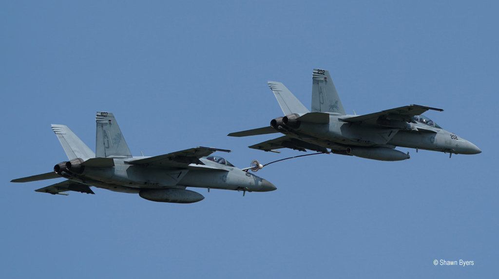 Air-to-air refueling was also demonstrated with an E model Hornet drogueing off an F model Hornet with a centerline tank. The Fleet returned in a six-ship delta formation. The seventh Hornet trails behind making a high speed pass in front of the unsuspecting crowd. All aircraft then return in smaller formations in a break to land. The jets then taxi by the crowd to parking.