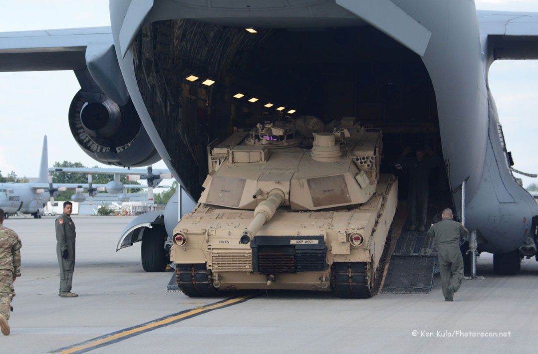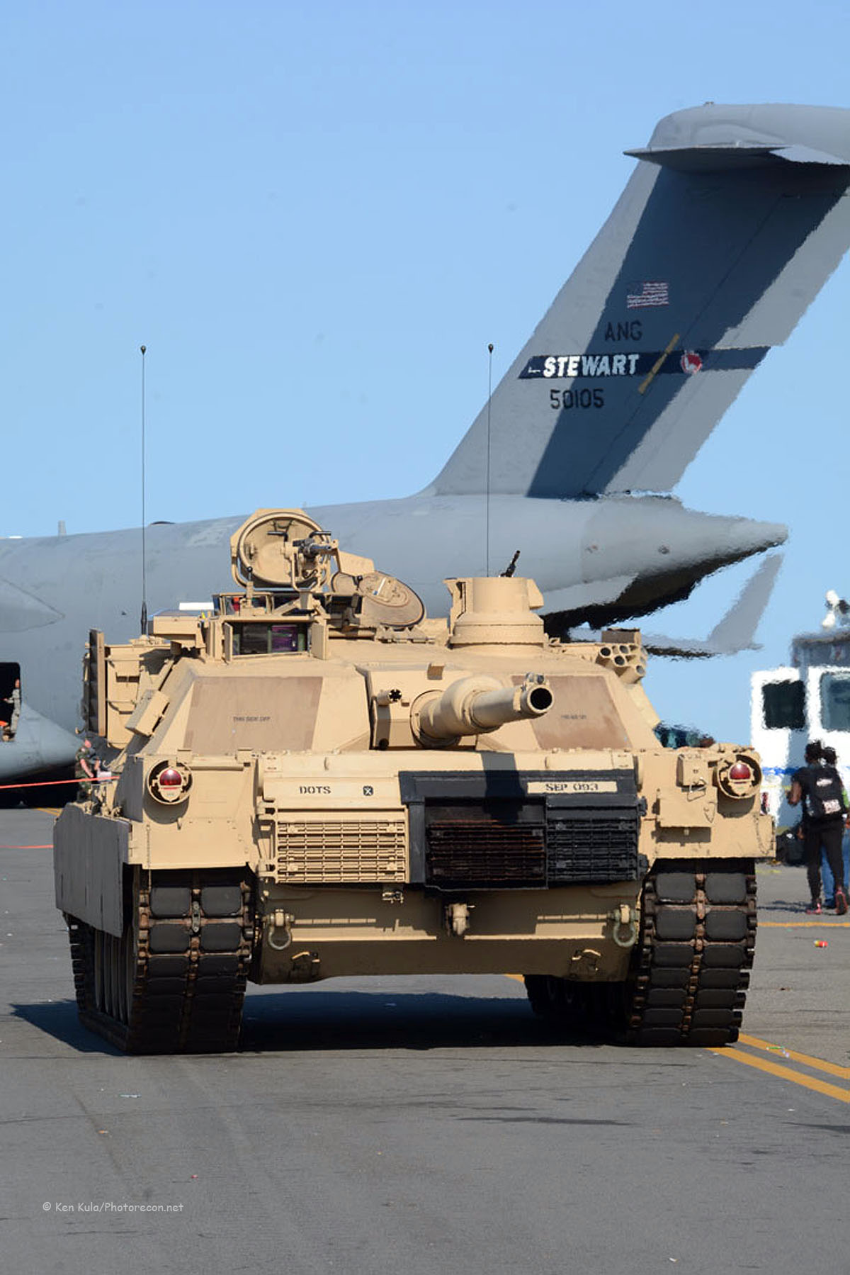 As this media opportunity wound down, another of the Wing’s jets arrived mid-afternoon and unloaded an M1A2 Abrams tank from Fort Benning GA. The tank was part of the air show’s static display, and would be transported to nearby West Point Military Academy for a program after the show and holiday. The sight of the tank gingerly descending the cargo ramp, and then motoring off towards a taxiway was slightly unnerving, the large vehicle maneuvering in the vicinity of some giant aircraft!