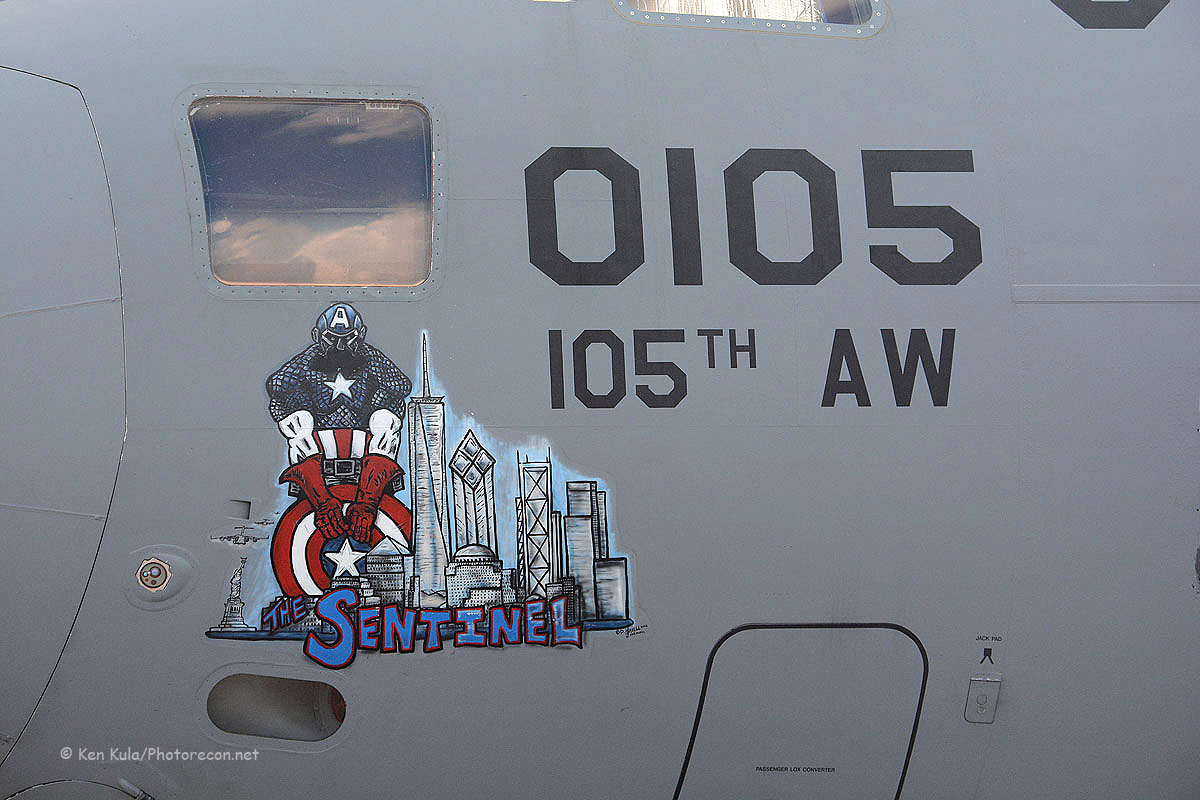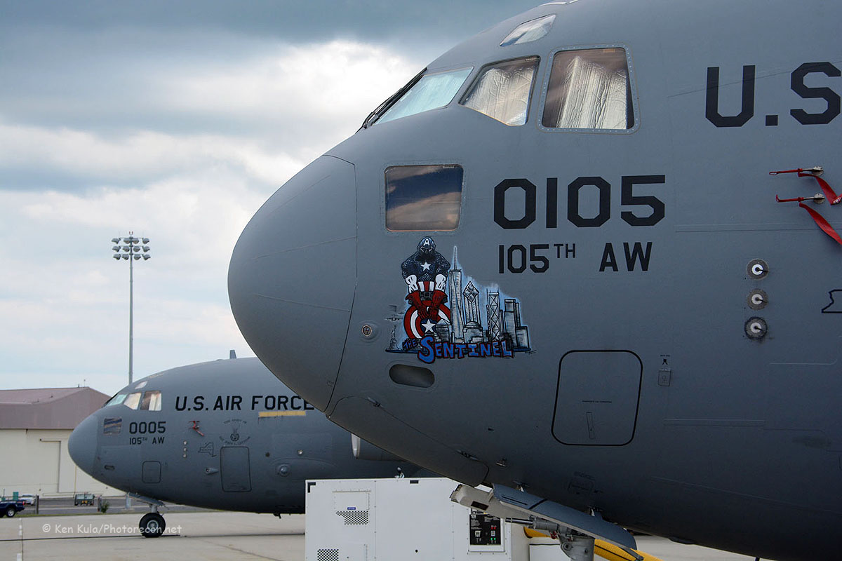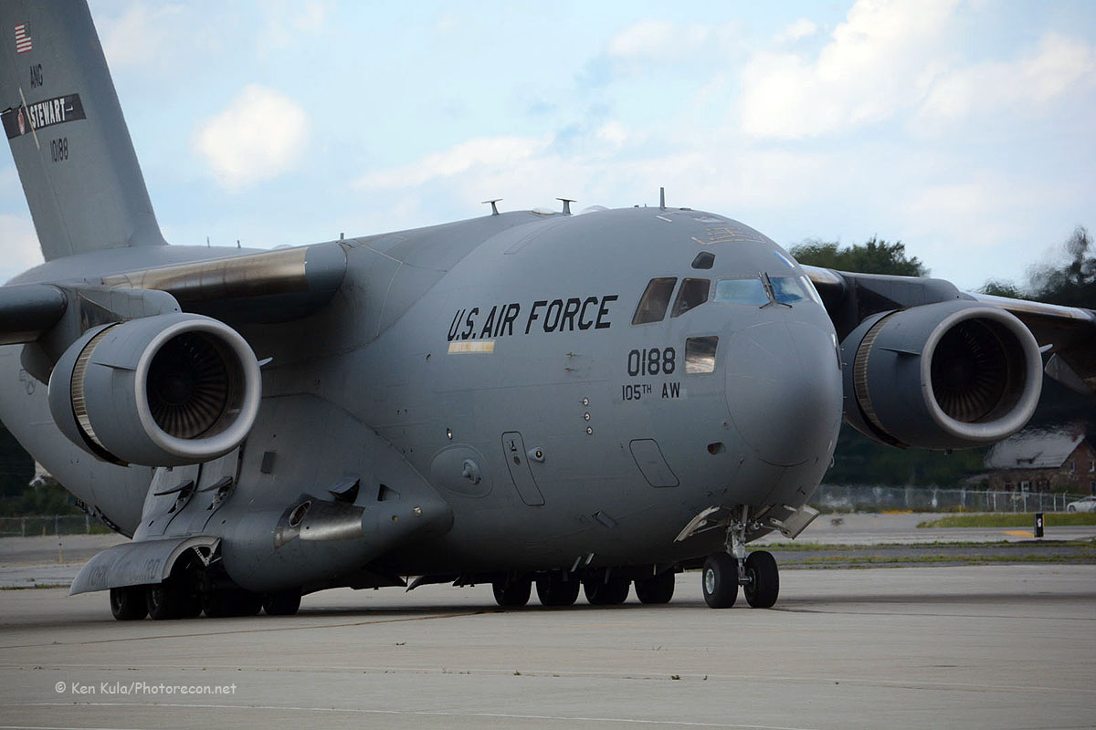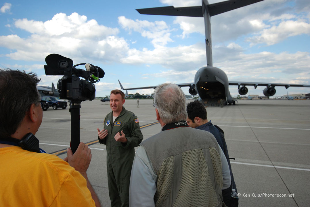 Thursday before the weekend show, it was Media Day aboard the Stewart Air National Guard Base in Newburg. Although physically located across the airport from where the air show would be flown, the base would be the Air Force Thunderbirds’ home-away-from-home during the weekend. Additionally, the host 105th Airlift Wing was bringing a new treat to the air show table, in the form of a first-time-ever locally flown C-17 flight demonstration. Members of local media got an opportunity to talk with two of the eight C-17 flight demonstration crewmembers, who explained what the aircraft would do during their routine, and what technological marvels are built into the jet that wouldn’t be seen. There was a detailed tour of one of their jets too, from the cargo deck to the cockpit.