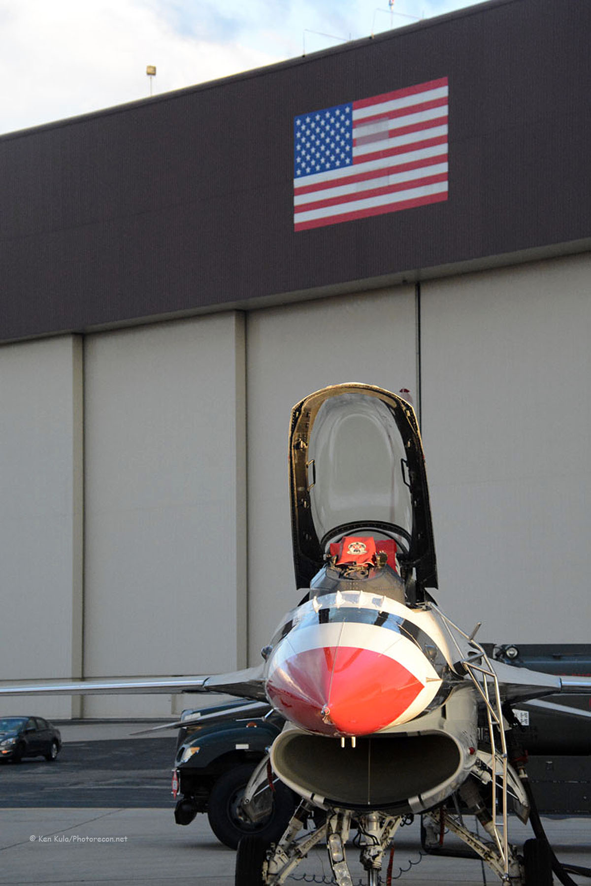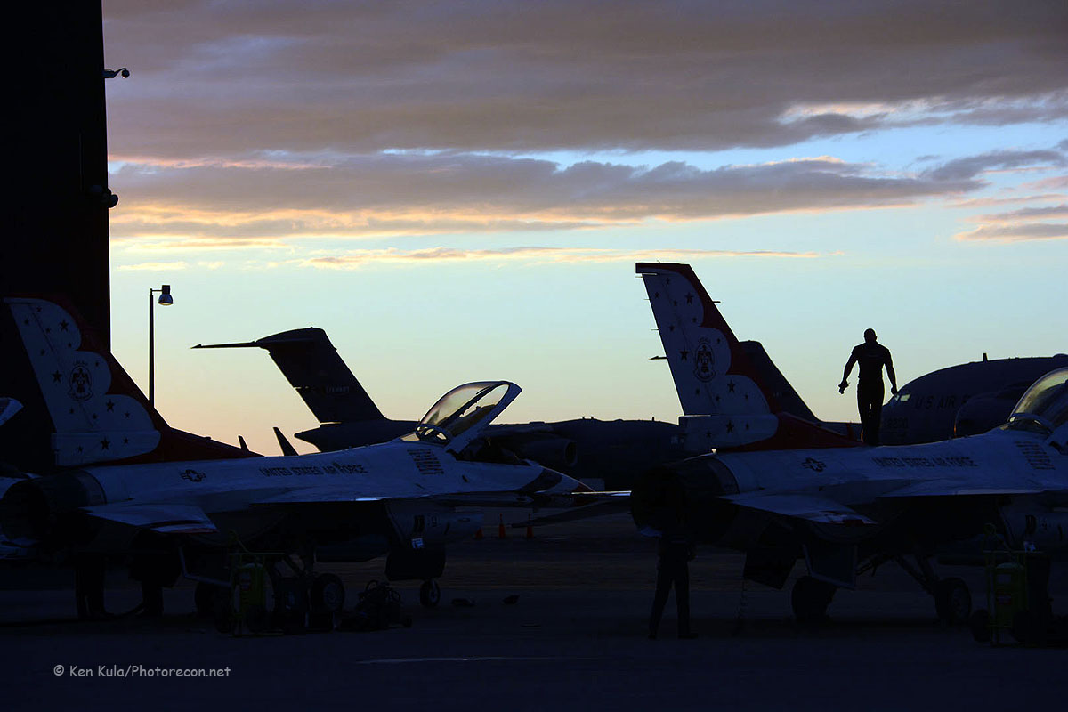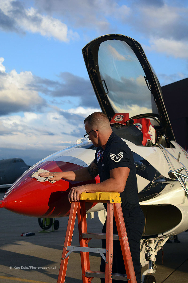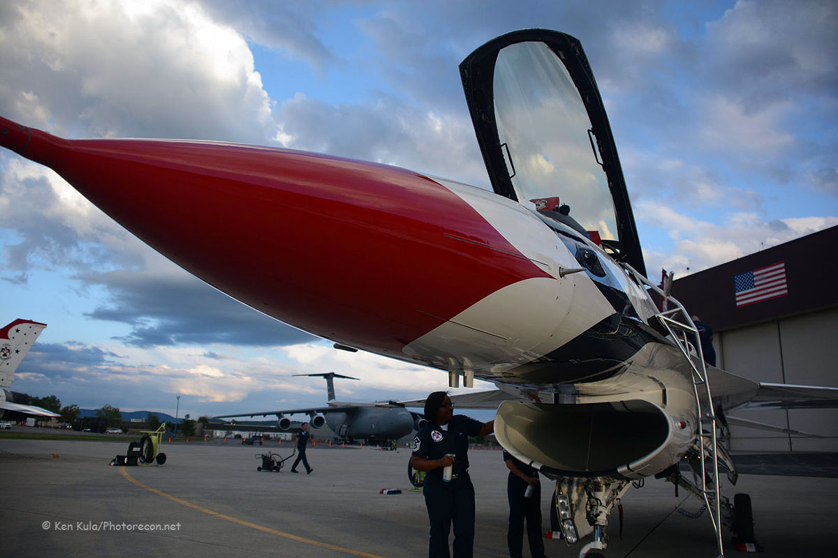 The Air Force’s Thunderbirds, whose efforts leading up to the show were equally as impressive as their two air show performances, also arrived on Thursday. A C-17 Globemaster III departed Las Vegas NV’s Nellis AFB very early in the morning (a 5AM show time); aboard were the non-flying ground crew – officers and enlisted men and women who perform a wide range of duties, including crew chiefs, aircraft maintainers, Public Affairs personnel and even the Vice Commander of the United States Air Force Warfare Center (USAFWC), Brigadier General Paul Welch.