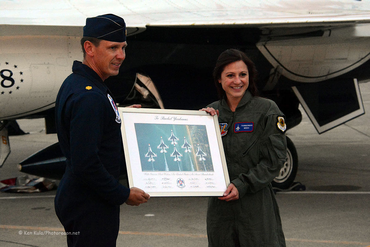 Up until now it seemed like a usual deployment for the team, but just prior to Thunderbird 8 returning from its media flight, we were invited to join the assembled pilots and ground crew to witness the planeside promotion of a trio of Thunderbirds. Senior Airman Tabatha McCarthy, Technical Sargent Gregory Lynch and Captain Nicholas Eberling all received promotions. The Squadron Commander, Lt. Colonel Christopher Hammond, spoke eloquently of each Air Force member, and assisted by General Welch, then ceremoniously “punched on” the next rank on each team member’s shoulder.