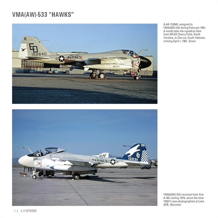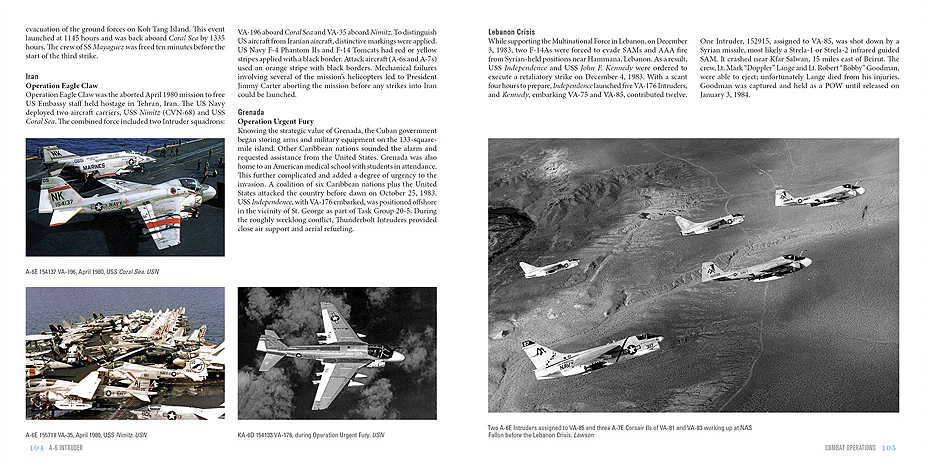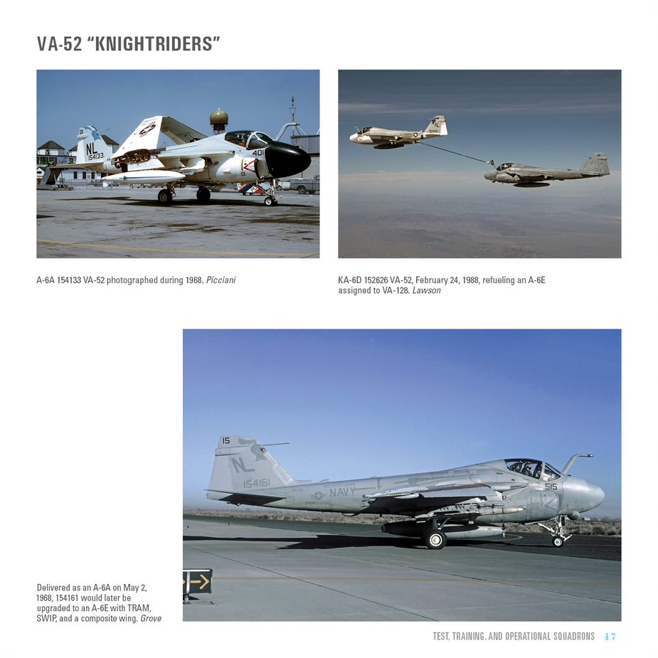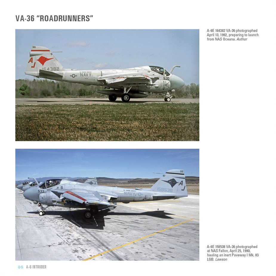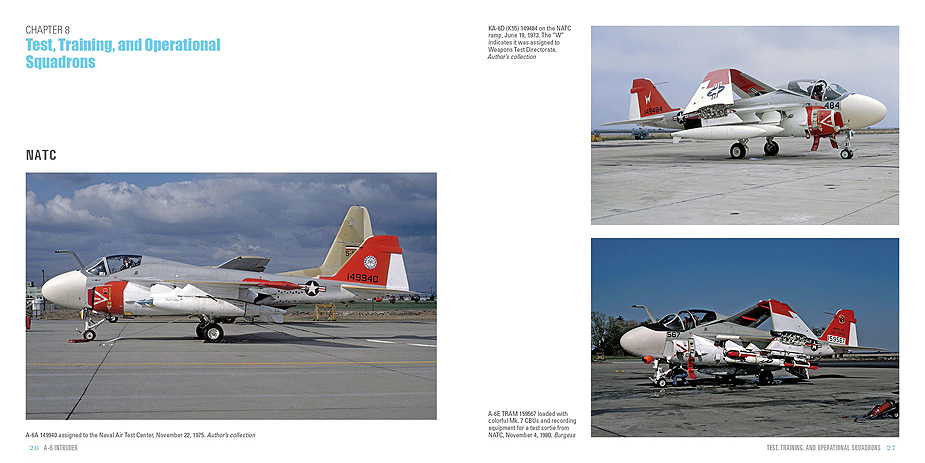 Following the many model changes of the A-6, Brown adds a nicely detailed section featuring each Intruder squadron beginning with NATC at NAS Patuxent River and continuing with all the attack squadrons. Each squadron is well illustrated with color images during various time periods.