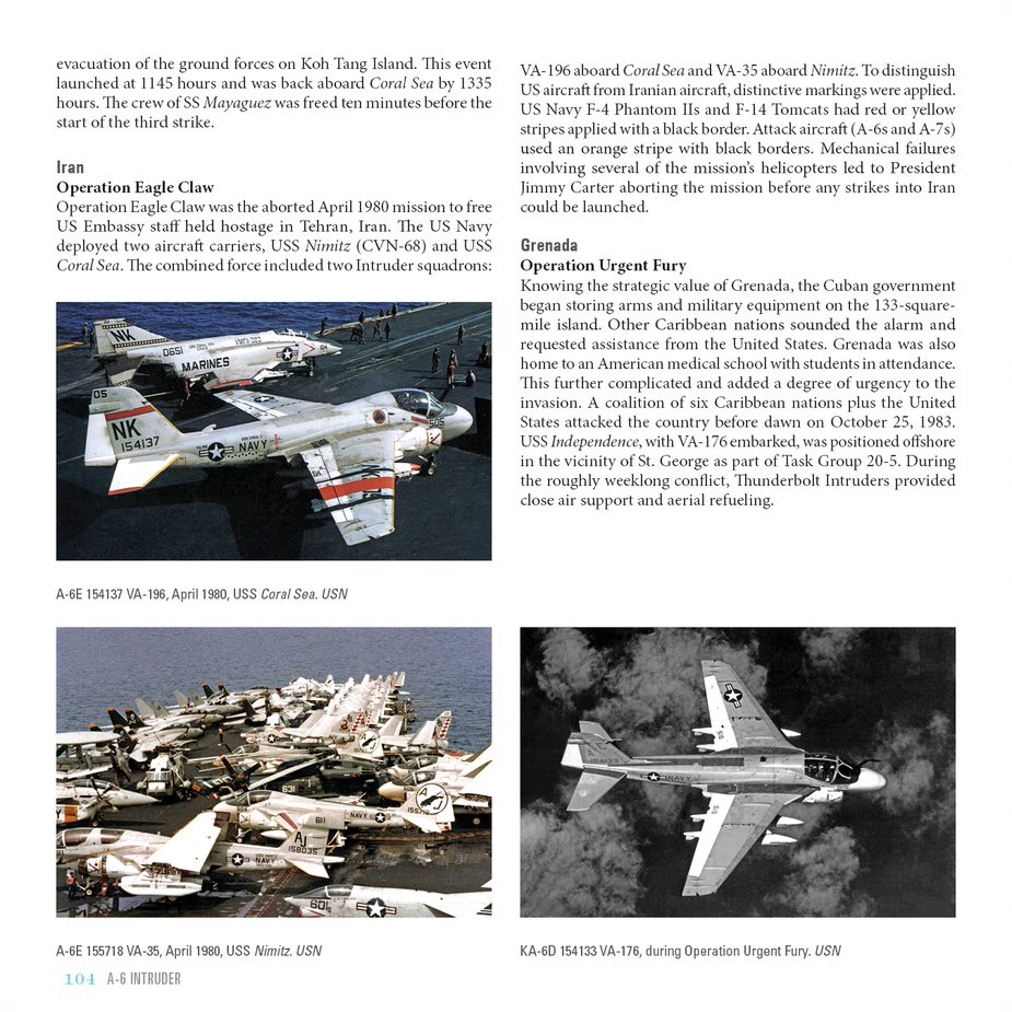 Chapter 9, Combat Operations, naturally begins with the Vietnam War, when VA-75 “Sunday Punchers” was the first Intruders to begin combat operations from the deck of the USS Independence (CVA-62) off the coast of South Vietnam during the summer of 1965. Brown covers the deployment of additional Intruder squadrons as they entered the war and integrates period squadron patches among the many images illustrating this chapter. Brown continues with the Gulf Wars, highlighting the numerous operations that followed, and is well-illustrated with images of Intruders that participated in these combat operations some showing the missions marks applied to the Intruder’s fuselage, a proud Navy tradition dating back to World War 2. These being an indication not only of the number of missions flown, but also as a reminder to the dangers the air crew experienced in the prolonged combat One forgets how important the Intruder was and the many combat operations that it participated in during its long and distinguished career.