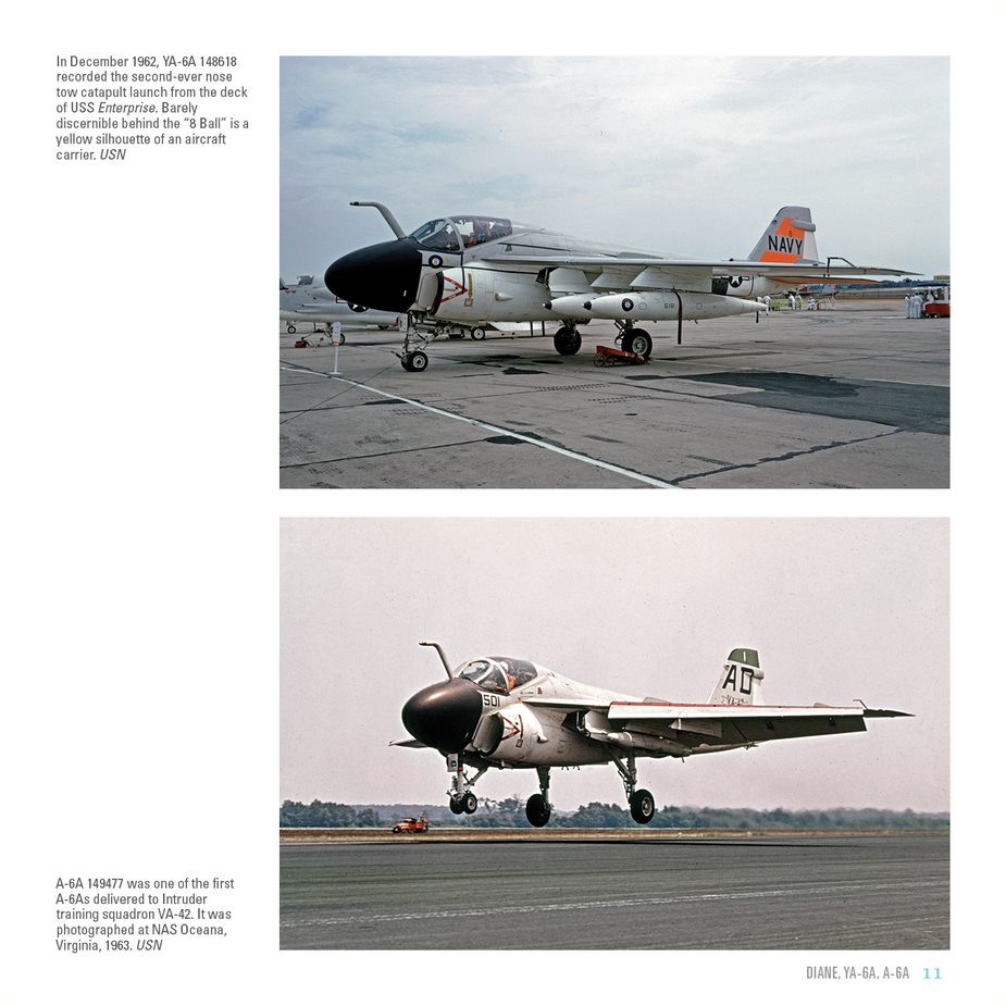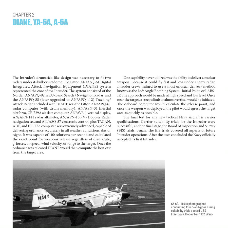 The book covers the origin of the A-6 from the initial Department of Defense (DOD) request for a new carrier based night, all weather attack aircraft as a replacement for the US Navy’s aging piston engine AD Skyraider. Author Brown follows with the resulting YA2F-1 prototype, its development program and is well-illustrated with images of the prototype Intruders. He continues through the life of the A-6 with each subsequent chapter dedicated to the next model change and upgrade that evolved during its nearly four decades long history, ending with the last model, the A-6F, of which only 5 were built. That program was canceled before production could begin in favor of the proposed A-12 program, it too being cancelled.
