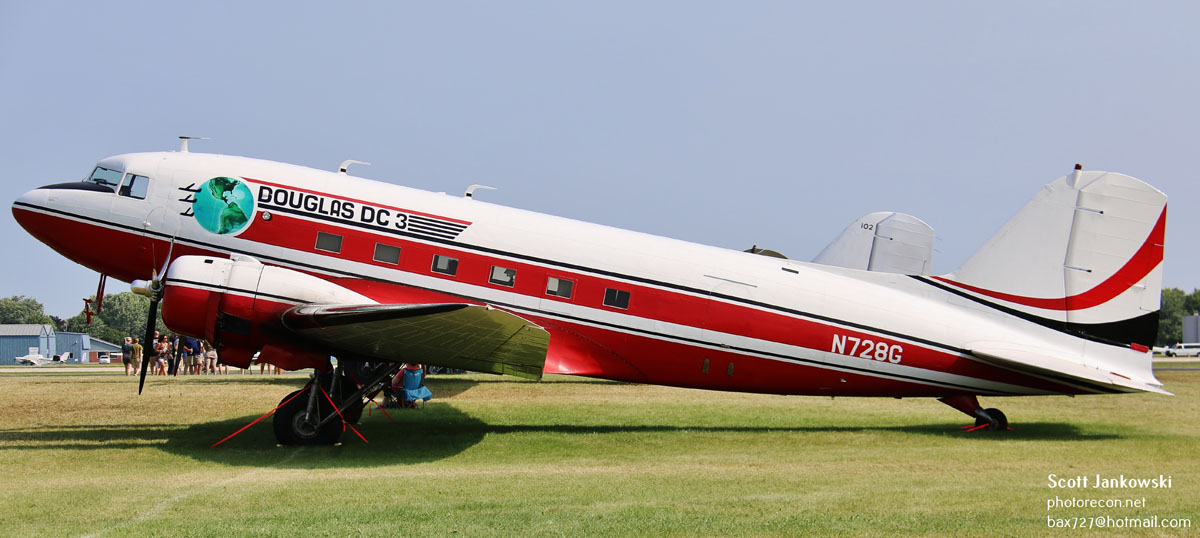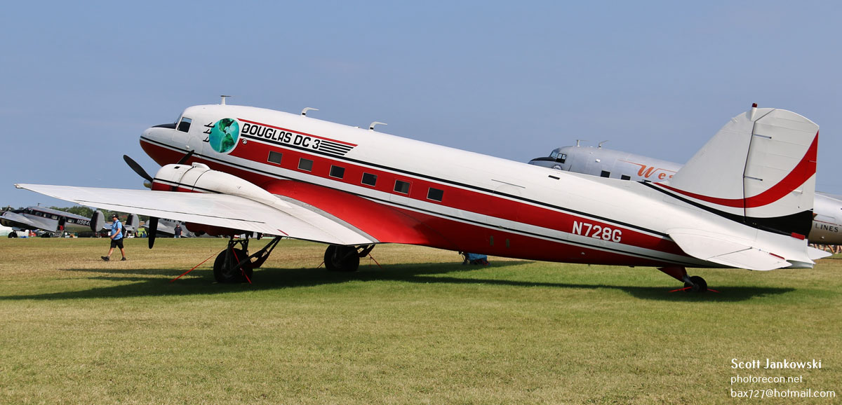 A pair of Douglas DC-3’s wearing either wearing a commercial airline livery or manufacturer livery were on hand. These included N728G manufactured as a C-47-DL for the United States Army Air Corps as serial number 41-7860. This C-47 would be transferred to Braniff Airways in 1942, and would pass through several different operators before Troy Alabama based KW Plastics would acquire the aircraft in 1986 and would repaint it in Douglas DC-3 hours colors.