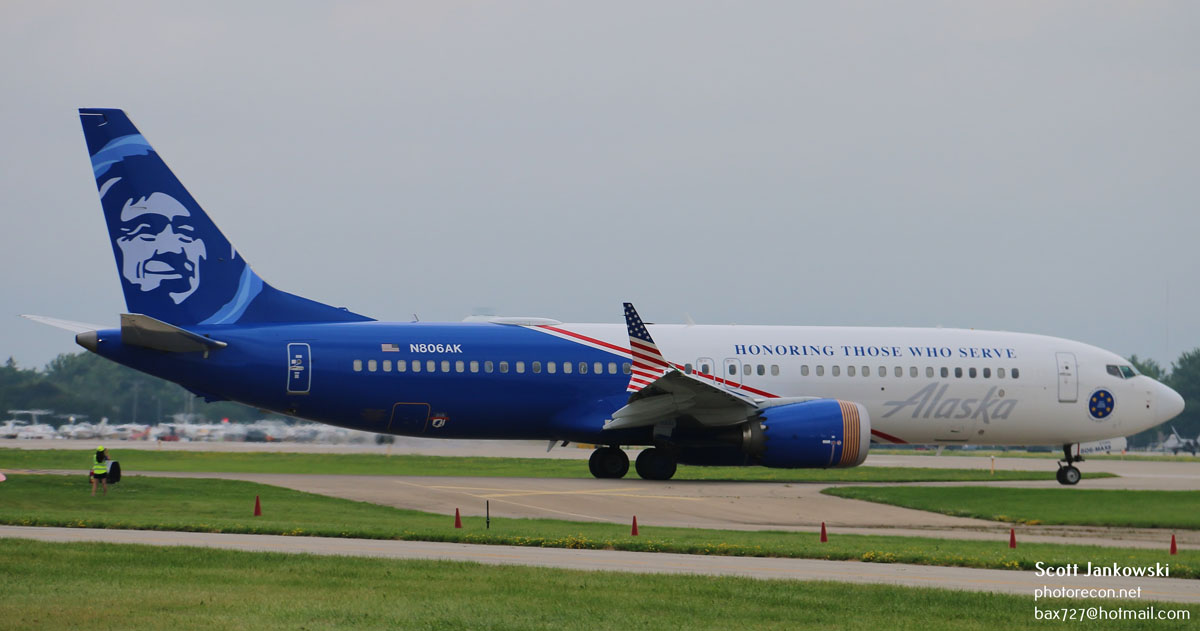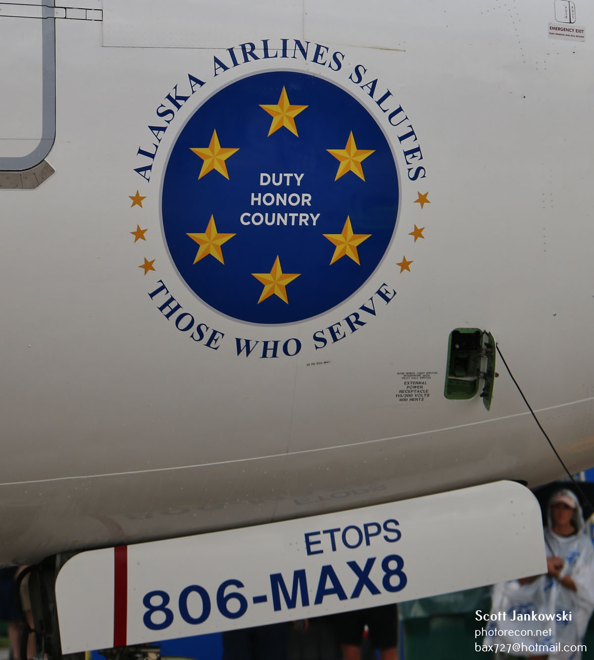 Alaska Airlines flew Boeing 737-8MAX, N806AK, in from Seattle Washington and had the aircraft displayed on Boeing Plaza. This 737 was delivered in 2024 as MSN 67806 and wears the Honoring Those Who Serve livery, this is the 4th aircraft in the Alaska Airlines fleet to wear these colors. This special livery is dedicated to the brave service members of the U.S. Military and their families. The design includes a red stripe and blue fuselage to incorporate elements of the American Flag, symbolic crests representing Alaska Airlines Fallen Soldier Program and an Alaska Airlines salutes medallion with 6 stars (6 strips on the engine cowlings) representing the 6 branches of the U.S. Armed Forces. The aircraft also wears the following quote “To those in uniform serving today and those who have served in the past, we honor you today and every day.” Alaska’s 737-8MAX’s seat 159 passengers and are powered by a pair of highly fuel-efficient CFM International Leap-1B engines giving the aircraft a cruising speed of 521 miles per hour and a range of 4,082 miles. Alaska operates 8 of these aircraft currently and has another 15 on order.