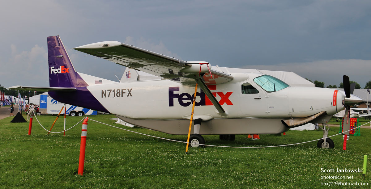 FedEx had a pair of Cessna products on display this year including N718FX, a 1995 manufactured Cessna 208B Super Cargomaster. This Caravan, MSN 208B0448 is operated by Baron Aviation Services and is based out of the FedEx Hub in Memphis Tennessee. The Super Cargomaster has a maximum payload of 3,675#’s and is powered by a single Pratt&Whitney PT6A-114A engine giving the aircraft a top speed of 186 miles per hour and a range of 1,230 miles. These Caravan’s provide service to smaller cities in the FedEx network and operate routes such as Milwaukee Wisconsin to Iron Mountain Michigan, Memphis Tennessee to Evansville Indiana and Phoenix Arizona to Yuma Arizona. FedEx currently flies 231 Caravan’s, making them the largest operator of the type.