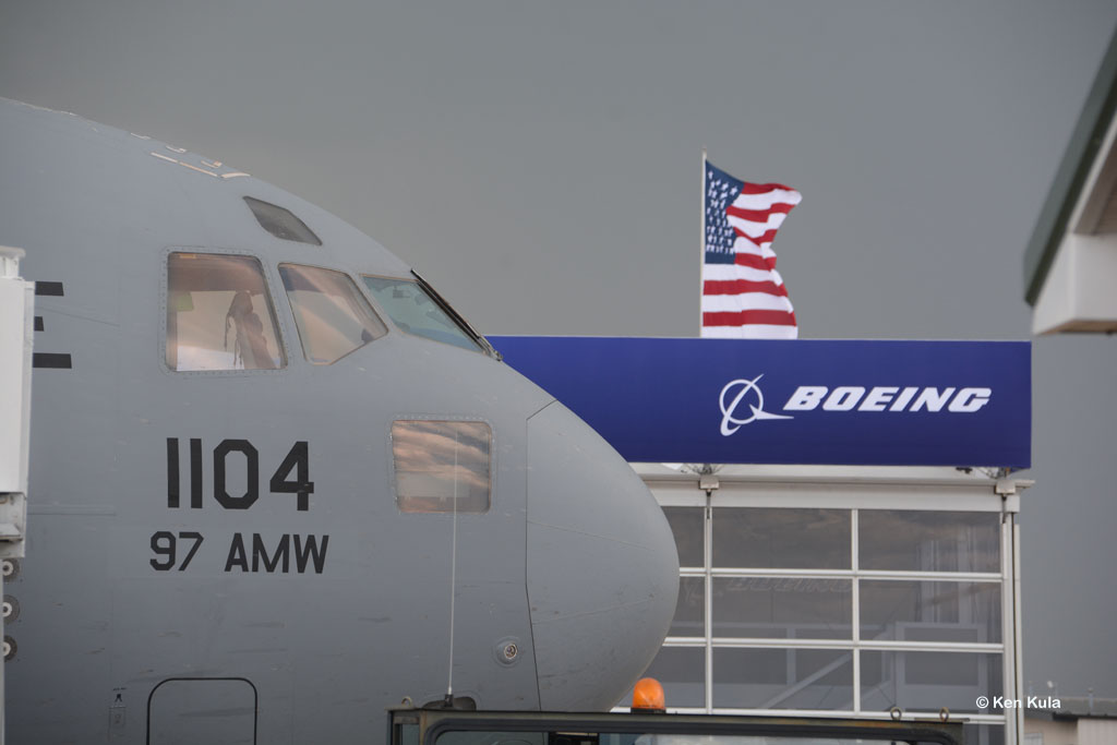 Boeing has a big presence at this year’s event. The impending Saturday afternoon storm darkens the background.