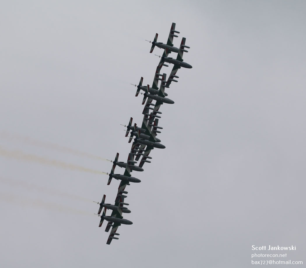 The closing part of the first act took the form of a trio formation of flybys from a two-ship of Mountain Home-based F-15E’s. Due to the lack of arresting gear at the show site, the Eagles staged out of nearby Selfridge Air National Guard Base, and treated the show crowds to the sound of freedom. The aircraft’s passes were in loose line abrest formation out over the runway, and featured afterburners and somewhat spirited overhead breaks, minus the landing gear and touchdown that one would normally perform after such a maneuver. The afterburners and modern jet noise were a great warm up for the afternoon’s performance by the Viper Demo Team!