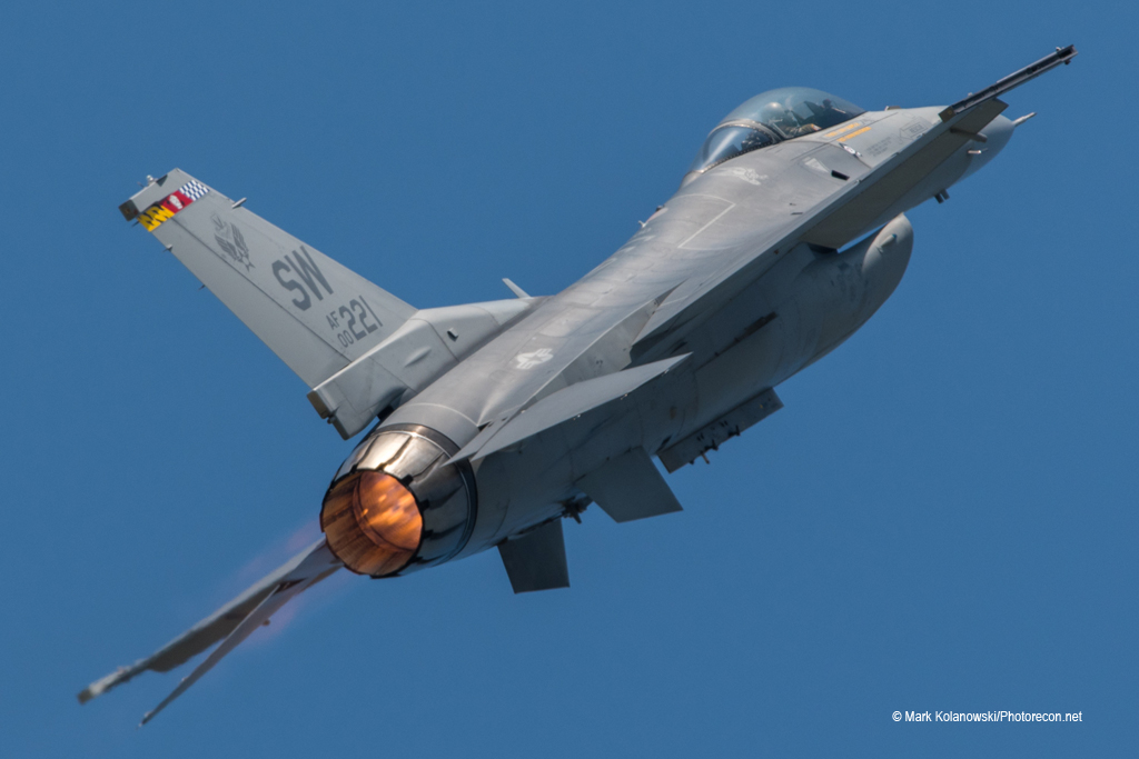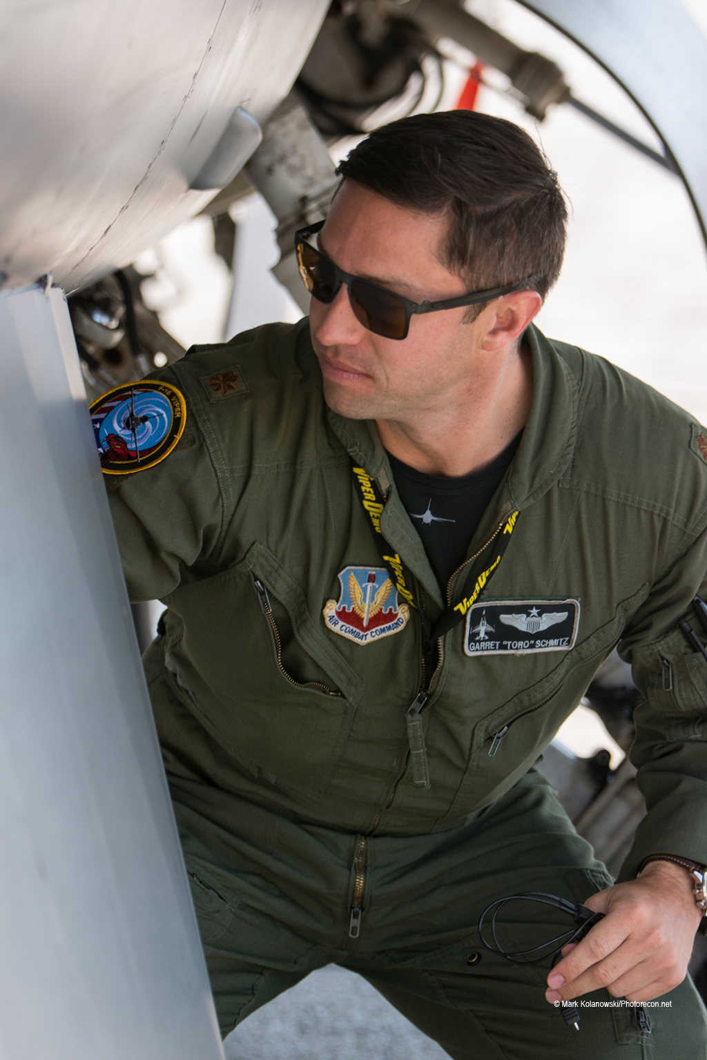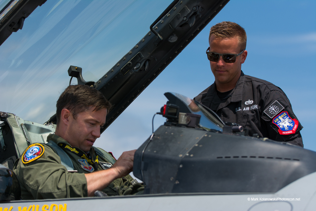 Following the battle, it was time to bring this show back to present day as the Viper Demo Team’s performance began. MAJ Garret Schmitz, Callsign: Toro, fired up the F-16 under the watchful eye of three of the team’s dedicated crew chiefs. PhotoRecon was able to witness and photograph the team’s preflight routine up close and personal. Even at shows like Thunder where the Viper isn’t staged right in front of the crowd, the ground routine was performed with the same crisp and professional style, with SSgt Trevor Griswold overseeing the startup, and SSgt Austin Dixon inspecting the jet during startup. With all systems go, Toro was marshaled out to the runway, and a salute and “Double Down” sign being thrown up between pilot and crew.