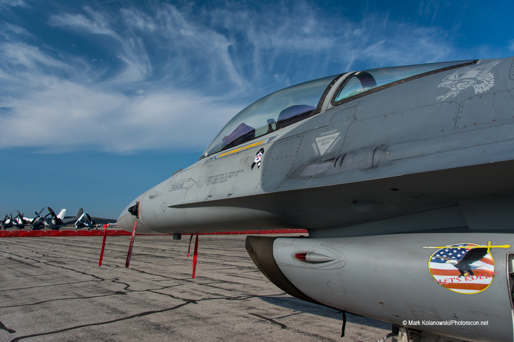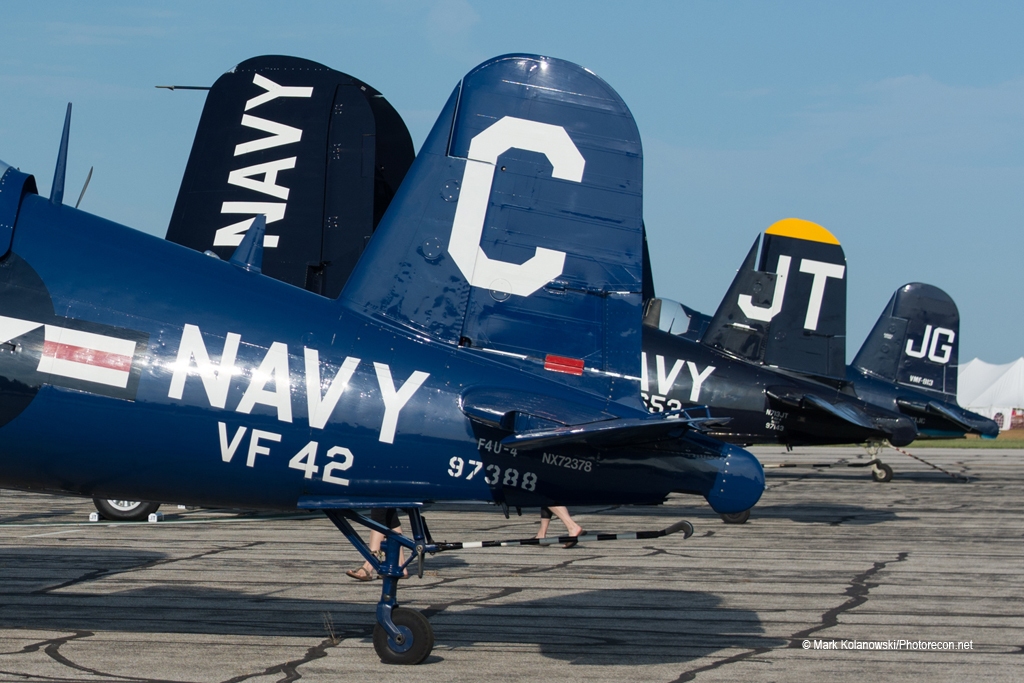 On the vast ramp, a wide variety of historic and modern aircraft were out on display. From South to North, a single line of aircraft included an RCAF CC-130J, two USAF ANG F-16s from Toledo, a Luftwaffe A400, a CH-47 and KC-135 from nearby Selfridge ANGB, a pair of USAF C-130s, another pair of Vipers courtesey of the Alabama Red Tails, a US Navy E-6B Mercury, and yet another C-130. The middle row featured two EF-18Gs from VAQ-129, and a smorgasbord of T-6 Texan II’s from the USAF and US Navy, bookended by two of the Yankee Air Museum’s current restoration projects. A number of smaller warbirds and some of the P-51s filled the east side of the ramp. On the hot ramp at the far north end of the grounds sat the 11 Corsairs in addition to some of the other performer’s aircraft.