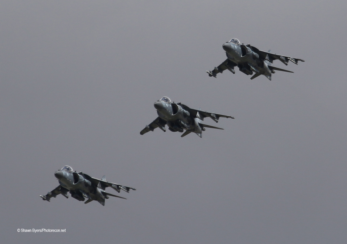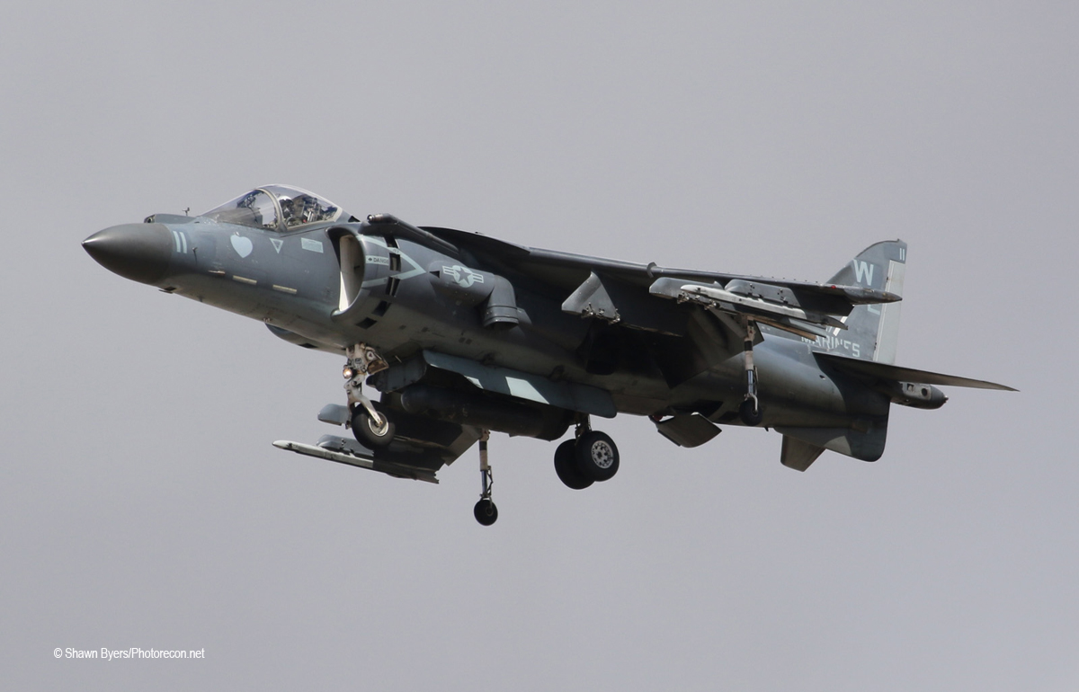 Late in the afternoon, a Harrier performed a solo demonstration. Most of the routine was on base. There was plenty of regular Harrier action, though as the “Tomcats” of VMA-311 had multiple sorties this day, returning to land over Route 32. I laughed when I heard a “Four down and locked” call on the scanner. Only in a Harrier.