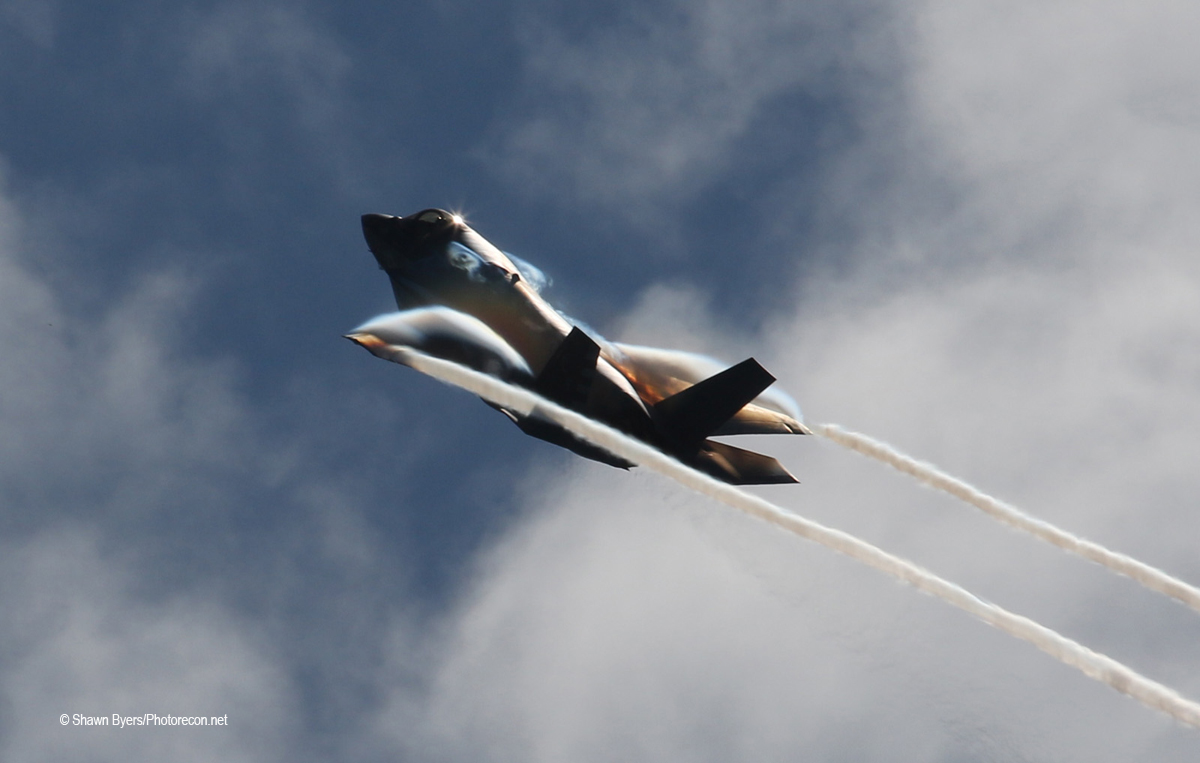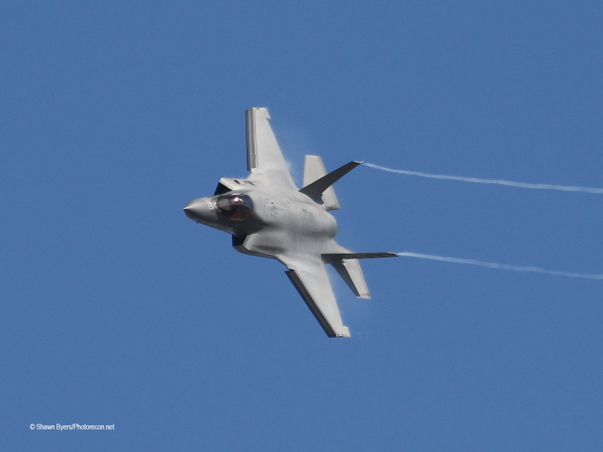 Fast forward to Friday morning. It was bright and sunny but I did not expect any regular flying. I heard an F-35 takeoff while checking out of my hotel up the street. Maybe it was the U.S. Air Force F-35A Demo Team going home? I decided to take a little time at a popular viewing spot in the dirt off East 32nd Street at the approach end of Runways 21L and 21R. After a very quiet period, an F-35B with an unmarked tail returned in slow approach to a vertical landing with all the doors open. The biggest thrill of the morning!