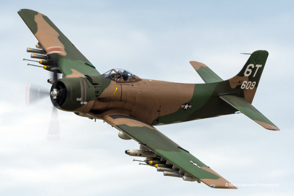 Following Bill’s recovery, the warbird portion of the show started featuring two aircraft from the Illinois based Warbird Heritage Foundation: The P-51D “Moonbeam McSwine” and the AD-1 Skyraider “Bad News”. For airshow fans, Moonbeam needs no introduction, having been flown by the late Vlado Lenoch, and “Bad News” is believed to be the oldest flying AD-1. The show box at Oakland County International is limited to only the smallest and slowest of aerobatic aircraft (Category III), with larger and faster planes being limited to non-aerobatic maneuvers due to a secondary spectator area (T-Hangars) across the field from the main show grounds.