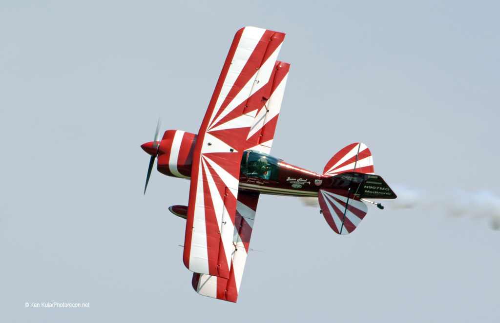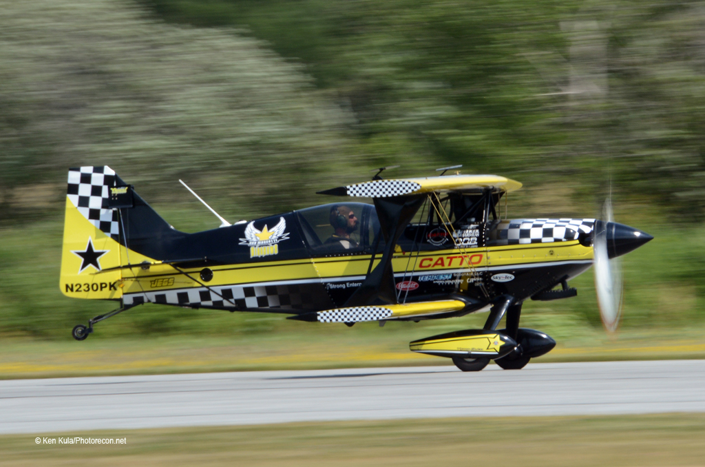 When the aerobatics portion of the show began, Jason Flood in his modified Pitts S-1S. The man has an interesting past… he soloed on his 16th birthday – in a Pitts special biplane. He was rated for, and competed in aerobatics at 17 years old in a Pitts biplane too. Jason survived a banner-towing accident in 2011, battling back from severe injuries. More recently, after some down time to recover from that accident, he began competing in aerobatics again. As his biography notes: “Jason has made a habit of ranking 1st place in just about all of the regional aerobatic competitions he attends”. He’s also one of the youngest showmen on the circuit, and home-based in New Jersey. With a deep blue sky in the background, his red and white Pitts looked sharp.