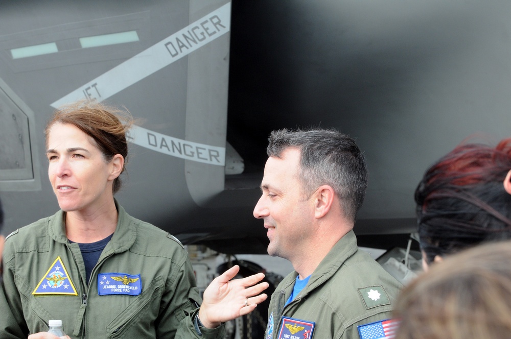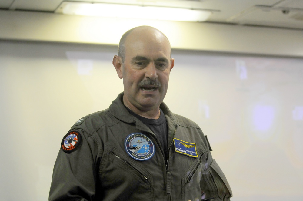 Cmdr. Wilson took time to discuss the testing of the F-35C and the carrier take offs and landings (traps). Cmdr. Wilson, who has previously flown F/A-18 C’s& F’s, recorded his 500th trap during this current round of testing, while in a F-35C.