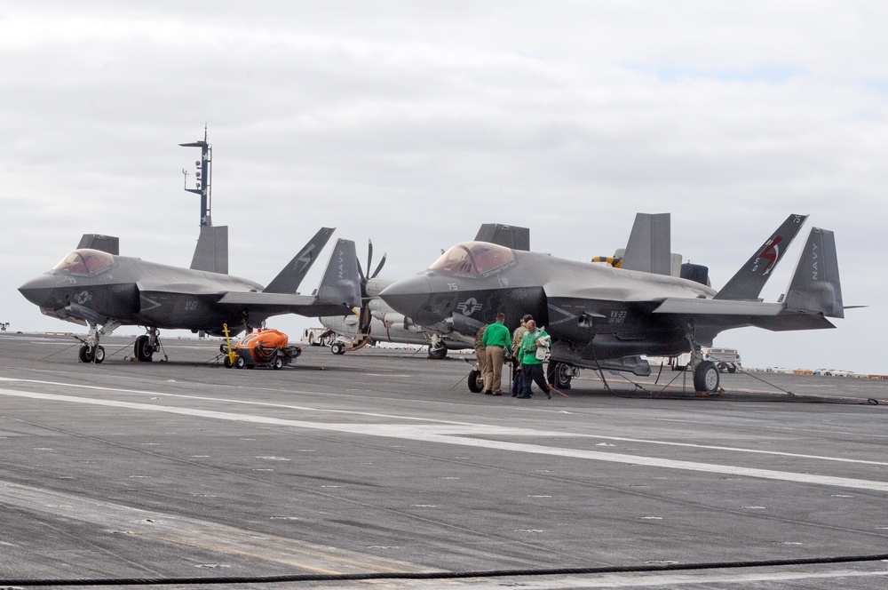 “Today is a landmark event in the development of the F-35C,” said Wilson, a Navy test pilot with Air Test and Evaluation Squadron (VX- 23). “It is the culmination of many years of hard work by a talented team of thousands. I’m very excited to see America’s newest aircraft on the flight deck of her oldest aircraft carrier, the USS Nimitz.”