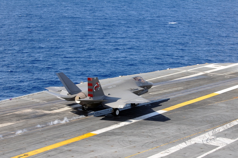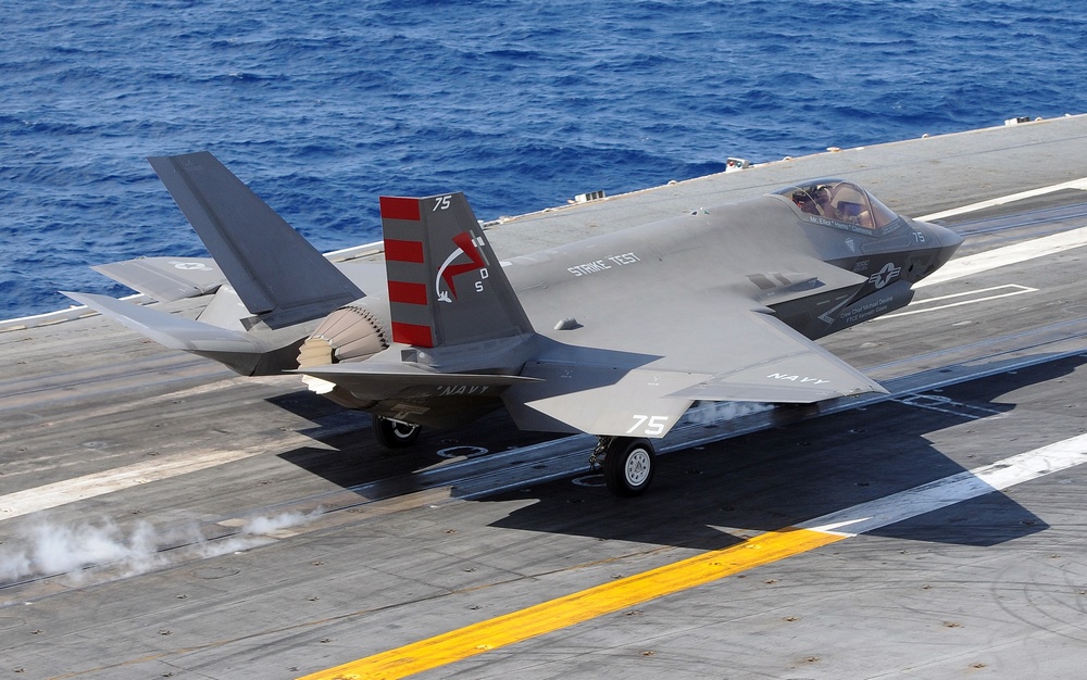 The first F-35C Lightning II Navy variant arrived at Strike Fighter Squadron 101, located at Eglin Air Force Base, Florida, on June 22, 2013. Continued testing finally brought F-35Cs onto an aircraft carrier, USS Nimitz (CVN 68). On November 3, 2014, the Navy made aviation history, as an F-35C Lightning II conducted its first arrested landing aboard an aircraft carrier off the coast of San Diego. Navy test pilot Commander Tony Wilson landed the CF/05 or #75 F-35C test aircraft at 12:18 p.m. aboard the USS Nimitz. Subsequent shipboard testing would last for 14 days.