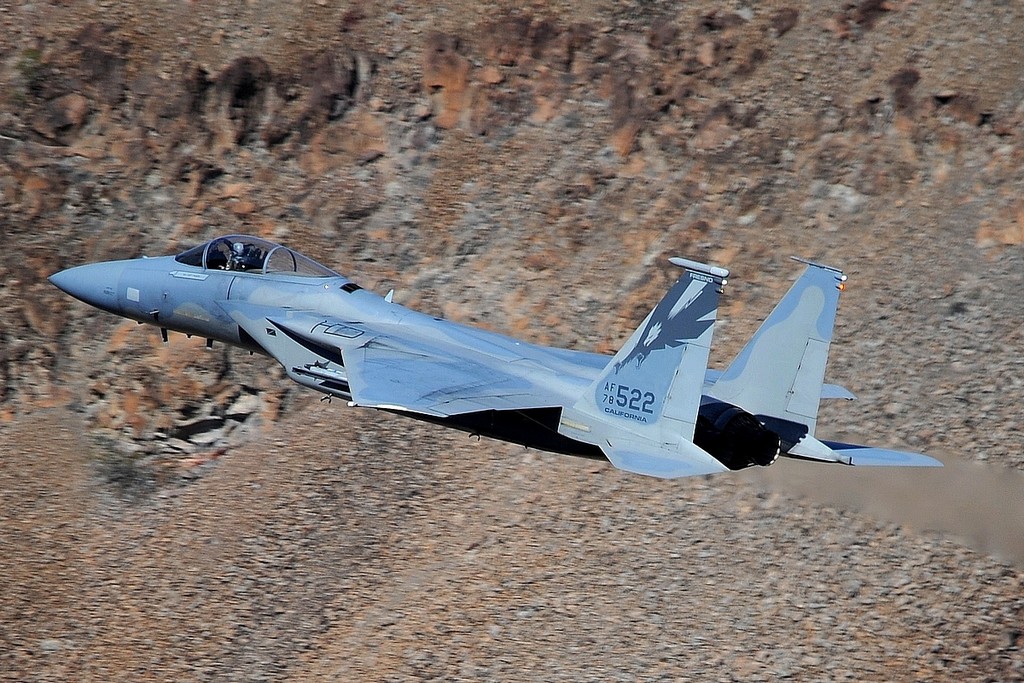 However, you should not stay on the plateau of the Fathers Crowley, there you get only the F-15 Eagles flying from the right through the canyon, usually the jets come from the west and fly east. By car you drive further into the terrain, where you can see more, and where you can make the best photos. The second point is on Highway 190 about 5 KM further down (direction towards Las Vegas), where you can park your car and hike about 20 minutes on foot… in this position you get the fighters from the side, however you have just a very short “warning time to see the jets coming. Around 10:00 AM, the first plane enters the canyon. You can tell early on which planes are flown by experienced pilots; the good go down low and those with less flying hours just “scratch” the canyon.