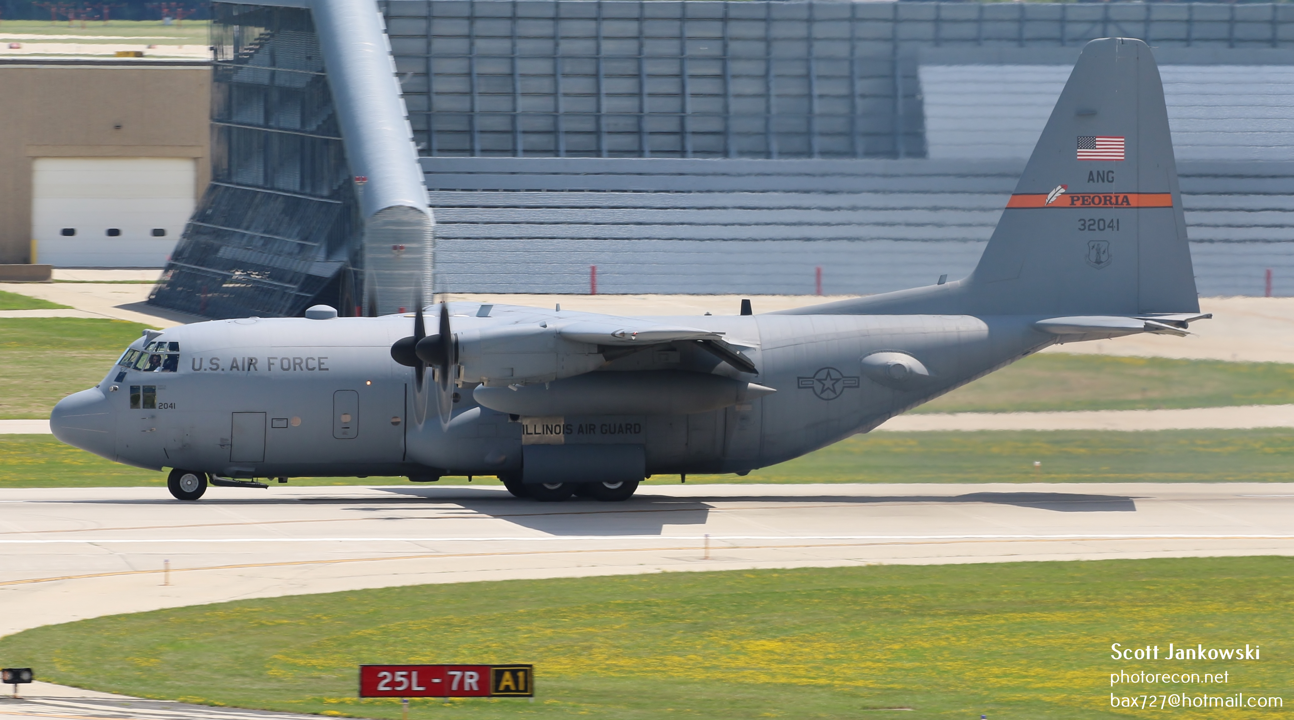 The 182nd Airlift Wing based out of Peoria International Airport Illinois and part of the Illinois Air National Guard provided a Lockheed C-130H3 Hercules to be used as the jump plane for the United States Air Force Wings of Blue Parachute Team. The H3 model of C-130 features an 8 bladed propeller which delivers more power and efficiency while reducing maintenance. The 182nd has flown the C-130 since 1995 in the tactical portion of the airlift mission and was formed in 1942 as the 304th Fighter Squadron.
