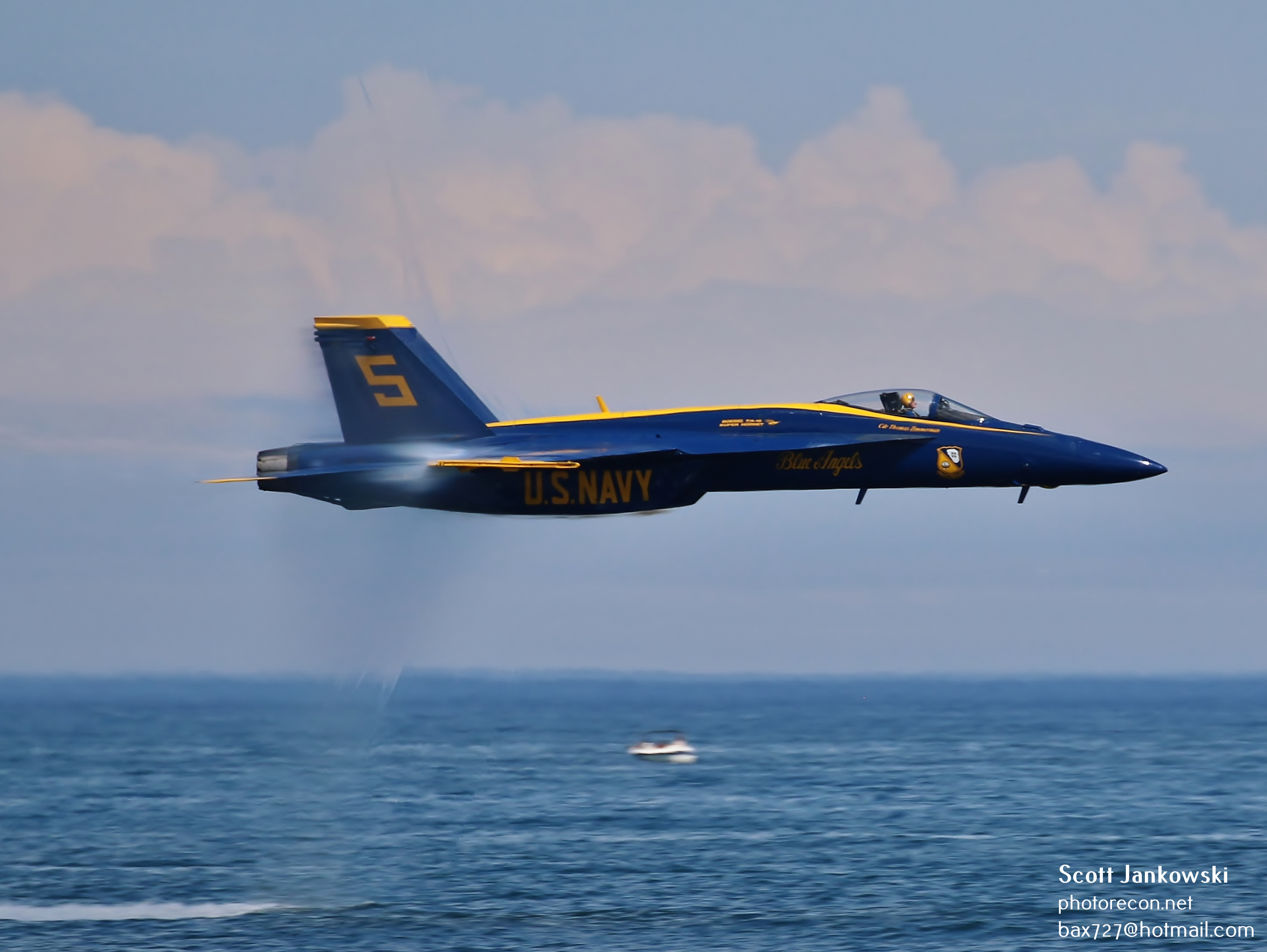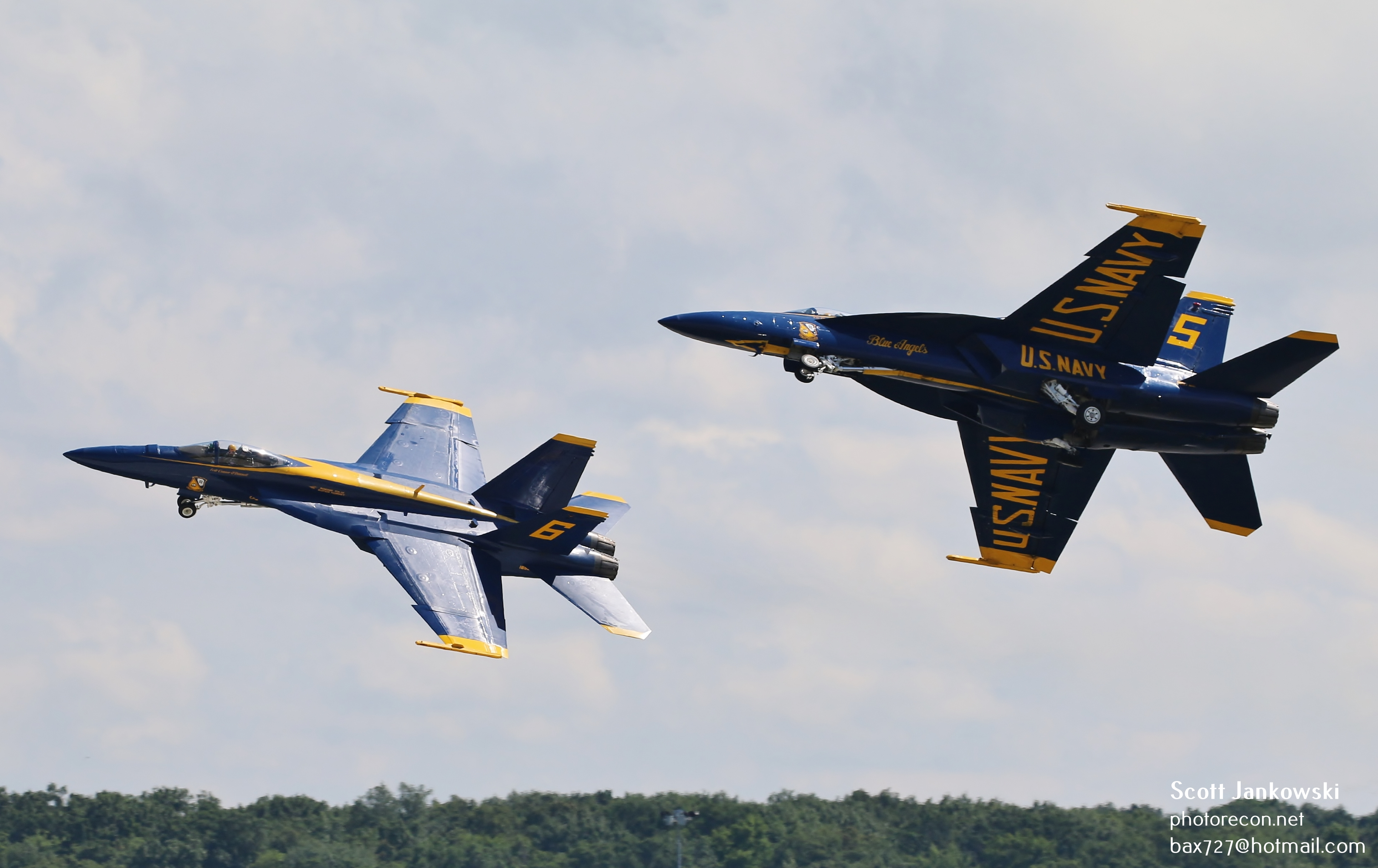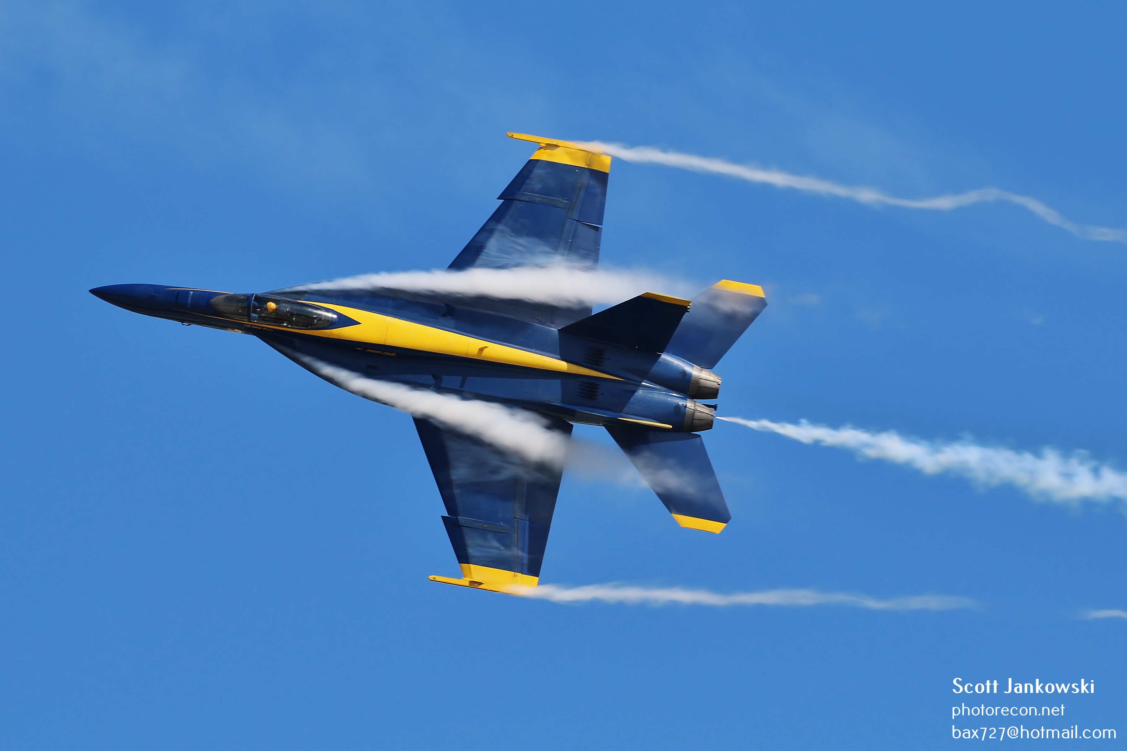 The Super Hornets the Blues fly were specially modified by Boeing by removing the weapons along with the addition of a smoke oil tank. The control stick was modified with a spring system for more precise control inputs. These aircraft are still considered combat capable and can be returned to a combat configuration in under 72 hours if need be. The Super Hornet is powered by a pair of General Electric F414-GE-400 afterburning turbofan engines that produce 21,000#’s of thrust each in afterburner, giving the aircraft a top speed of Mach 1.8. The Aircraft can pull up to 7.5 G’s, has a climb rate of 44,882 feet PER minute and a roll rate of 225 degrees per second. This gives the Super Hornet the performance characteristics that the Blues need to pull off such famous maneuvers as the Diamond Dirty Loop, Double Farvel, Fortis, Minimum Radius Turn, Burner 270, and the Sneak Pass.