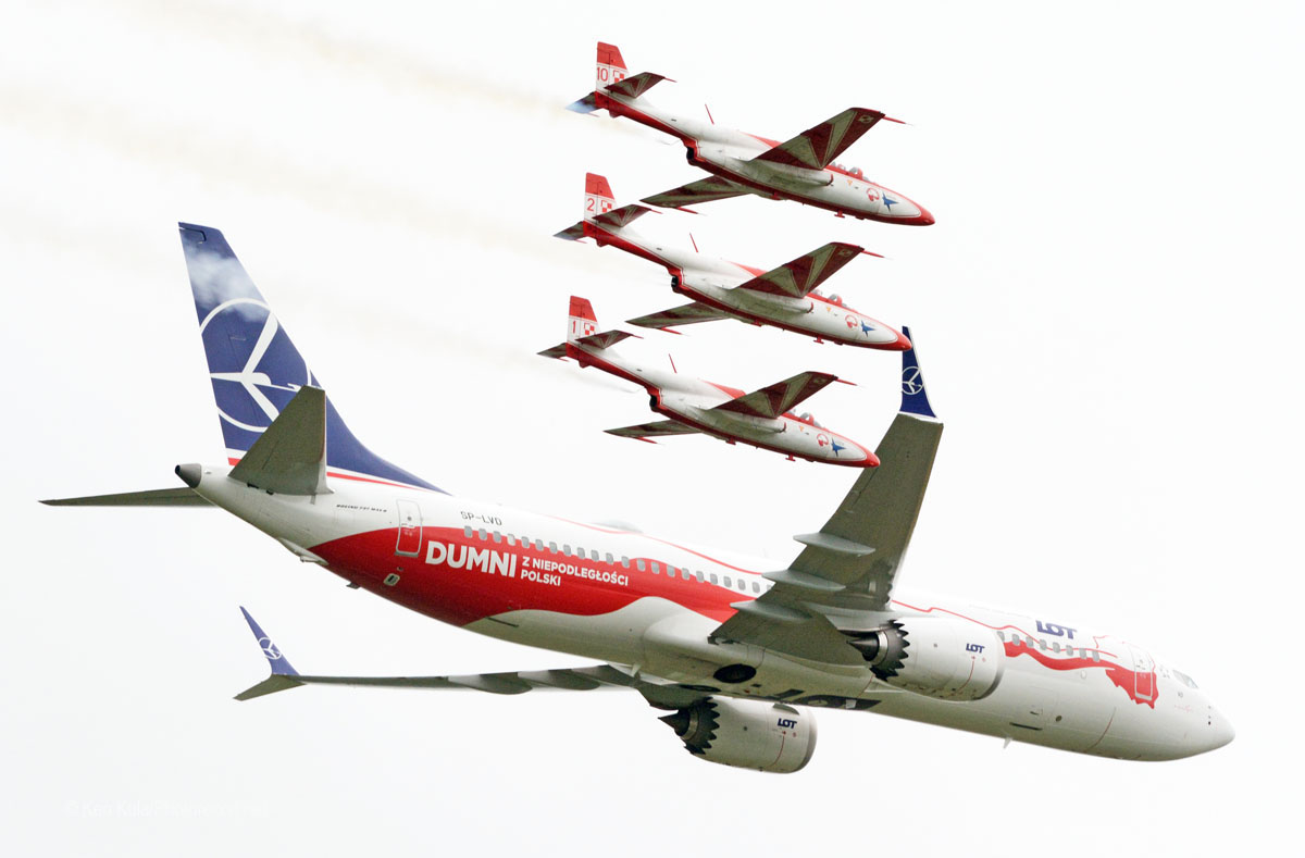 There were a handful of flypasts, including a quartet of new M-346 jet trainers, a NATO E-3A AWACS, and a special tribute to the 100th anniversary – a new LOT Airlines Boeing 737-8 MAX airliner leading the six TS-11 Iskrys; the Boeing returned to make a second pass waving its wings as it passed by.
