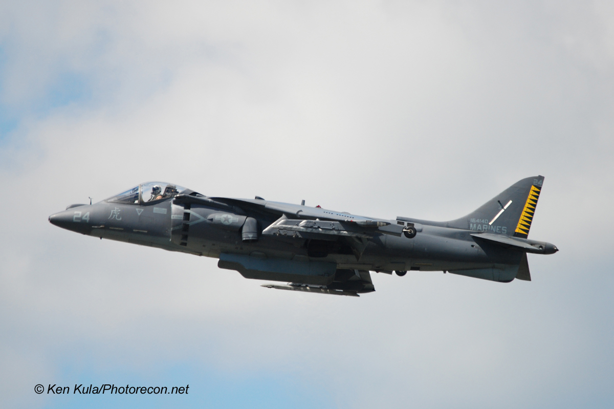 When the props from the WWII bomber stopped spinning, jet turbines started turning when one of the U.S.M.C.’s VMFA-542 AV-8B Harrier jets rocked Orange County with opening maximum high-speed passes before stopping and hovering just five-hundred feet over the runway at show center. All ears were covered when the Harrier belched enormous throws of hot exhaust as the jet made several spins in place before slowly descending to the ground. With engines cooled off, Maj. Matt Martinez rolled the jump-jet to a short take-off and executed several more high-speed passes, much to the delight of the enthusiastic crowd, who dared not remove their ear protection until the jet taxied to its line.