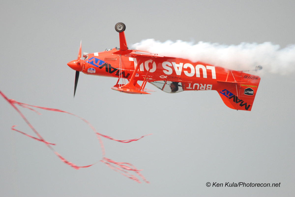 Next up, it was the U.S. Navy’s turn to provide lots of jet noise. VFA-106’s Super Hornet Demonstration Pilot Lt. Wallace “Gump” Miller and WSO Lieutenant Ben “Bueller” Kovesci showed why they are some of the best NAS Oceana, VA has to offer. The F/A-18F Super Hornet pilot and flight officer accurately demonstrated the capabilities of the Navy’s front-line attack/fighter jet. The audience was impressed as they performed multiple high-speed passes, square loops, touch and go’s, and mid-field carrier-breaks. Not be out done by military jets, Mike Wiscus in his Pitts Special wowed the crowd. With smoke on throughout his entire performance, Mike flew back and forth at a furious pace suggestive of a life sized R/C plane.