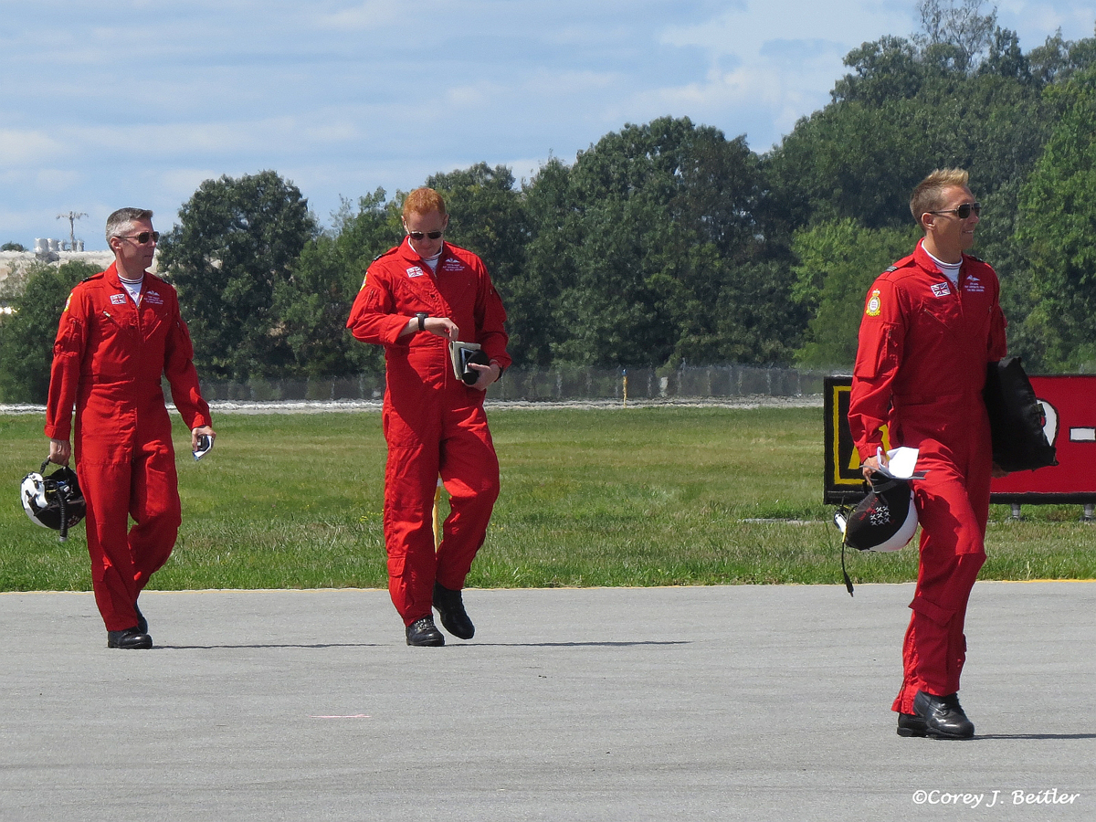 Similar to the U.S. Navy Blue Angels and U.S. Air Force Thunderbirds, the Red Arrows display is broken into two segments. During the first segment of the display, the nine pilots fly together in carefully synchronized aerobatic maneuvers, highlighting the teamwork required to fly nine jets in close formation, sometimes as little as six feet apart and at speeds of 350 miles per hour. For the second segment of the display, the nine pilots break up into two smaller sections for more dynamic display maneuvers. The first section of aircraft is nicknamed “Enid” and contains Red Arrows 1-5. The second section is known as the “Gypo” section and contains Red Arrows 6-9. The “Gypo” section also contains the famous Red Arrows “Synchro Pair”, the pilots known as “Red 6” and “Red 7”. The “Synchro Pair” perform various opposition maneuvers during the second half of the show. During these maneuvers, the “Synchro Pair” pilots fly straight at each other, often passing each other just a few feet apart. These maneuvers often thrill audiences at Red Arrows displays.