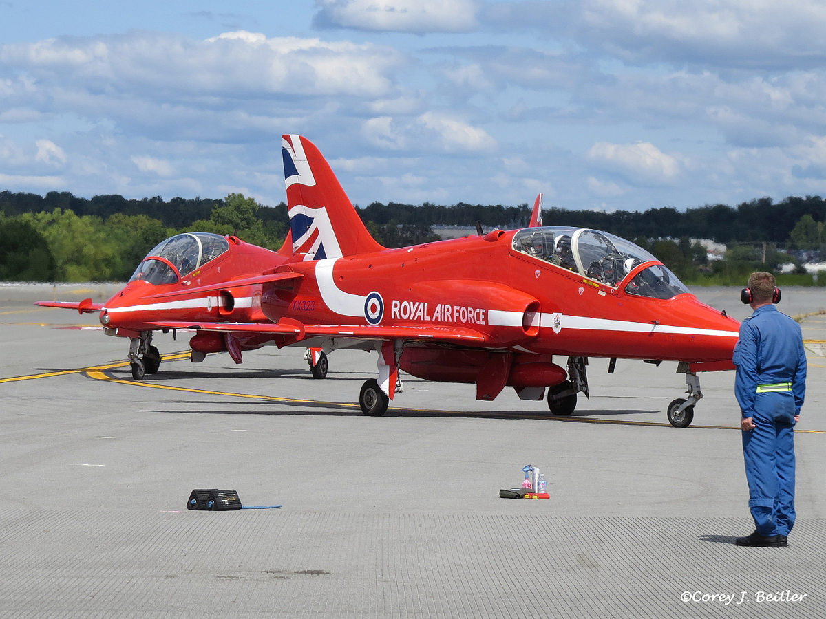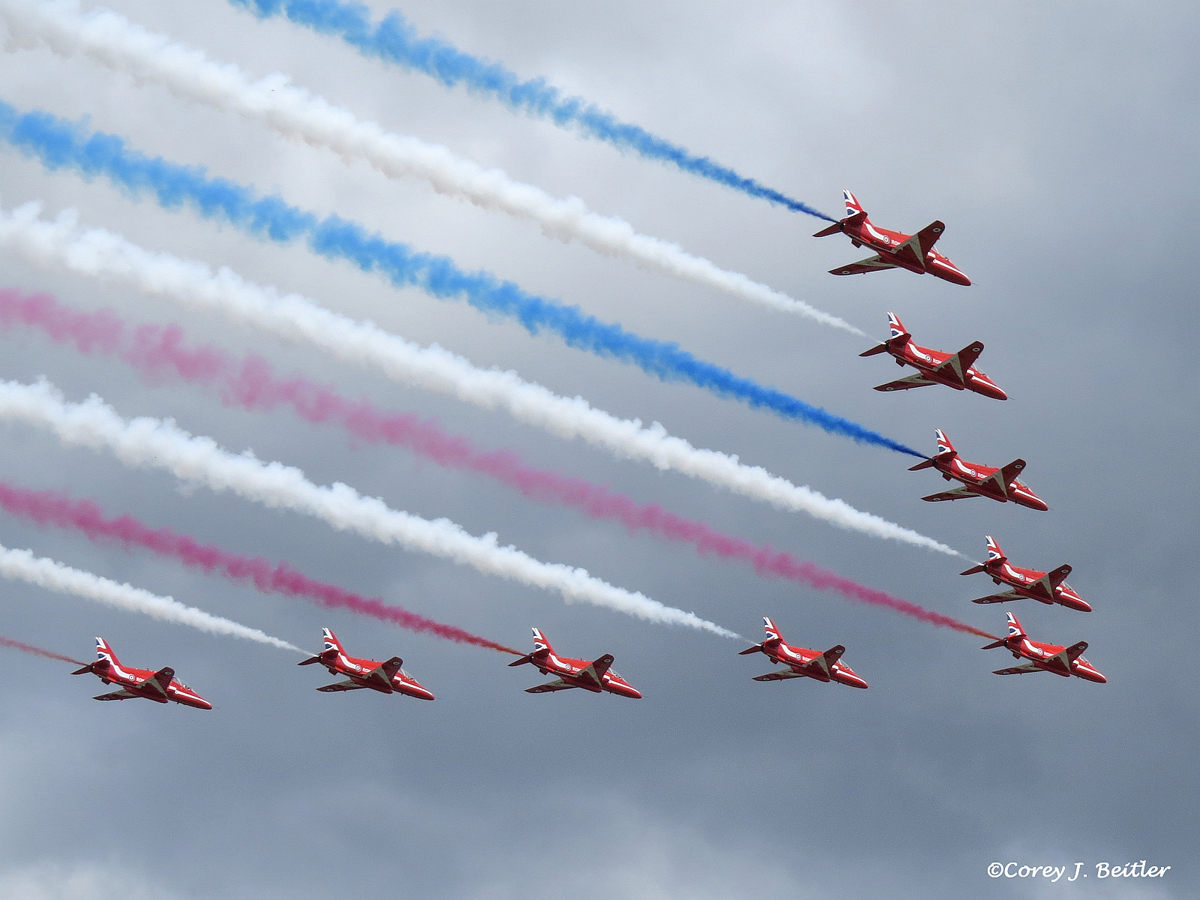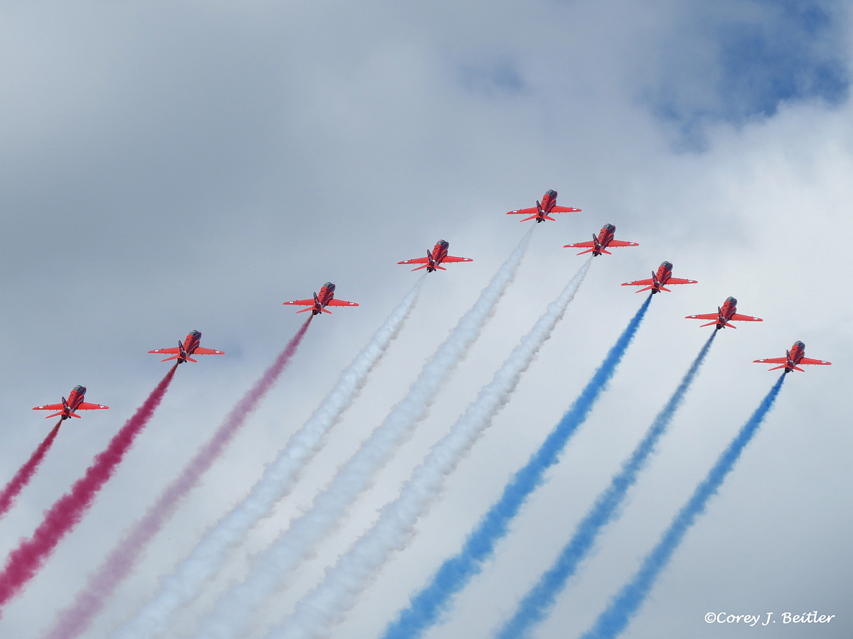 With a thundering roar, nine red and white jets streak overhead from behind the airshow crowd. The jets trail patriotic red, white, and blue smoke as they climb skyward with the crowd craning their necks as they look upward to get a better view. As the aircraft complete a loop, the smoke color changes to white and the nine pilots skillfully transition to a diamond formation. For approximately the next 30 minutes, the airshow crowd will be treated to a display of dynamic formation shapes, loops, and rolls by the Royal Air Force Aerobatic Team, the Red Arrows. Flying airshow displays and flypasts since 1964, the Red Arrows have become one of the most well-known and respected flight demonstration teams in the world. The team has represented the excellence of the British aviation industry, the Royal Air Force, and the goodwill of the United Kingdom at airshows and aviation events throughout the world throughout their existence.