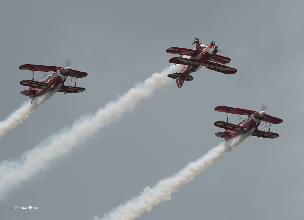 Civilian acts included Rick Volker in his purple Sukhoi 26 M, Erik Edgren in an underpowered high wing Taylorcraft, the Alabama Boys comedy act with a Piper Cub and the Northern Stars Aeroteam with a 3 ship Pitts S2B routine. This was my first time seeing them. Precision Exotics was also present and could be seen and heard driving on taxiways and the runway.
