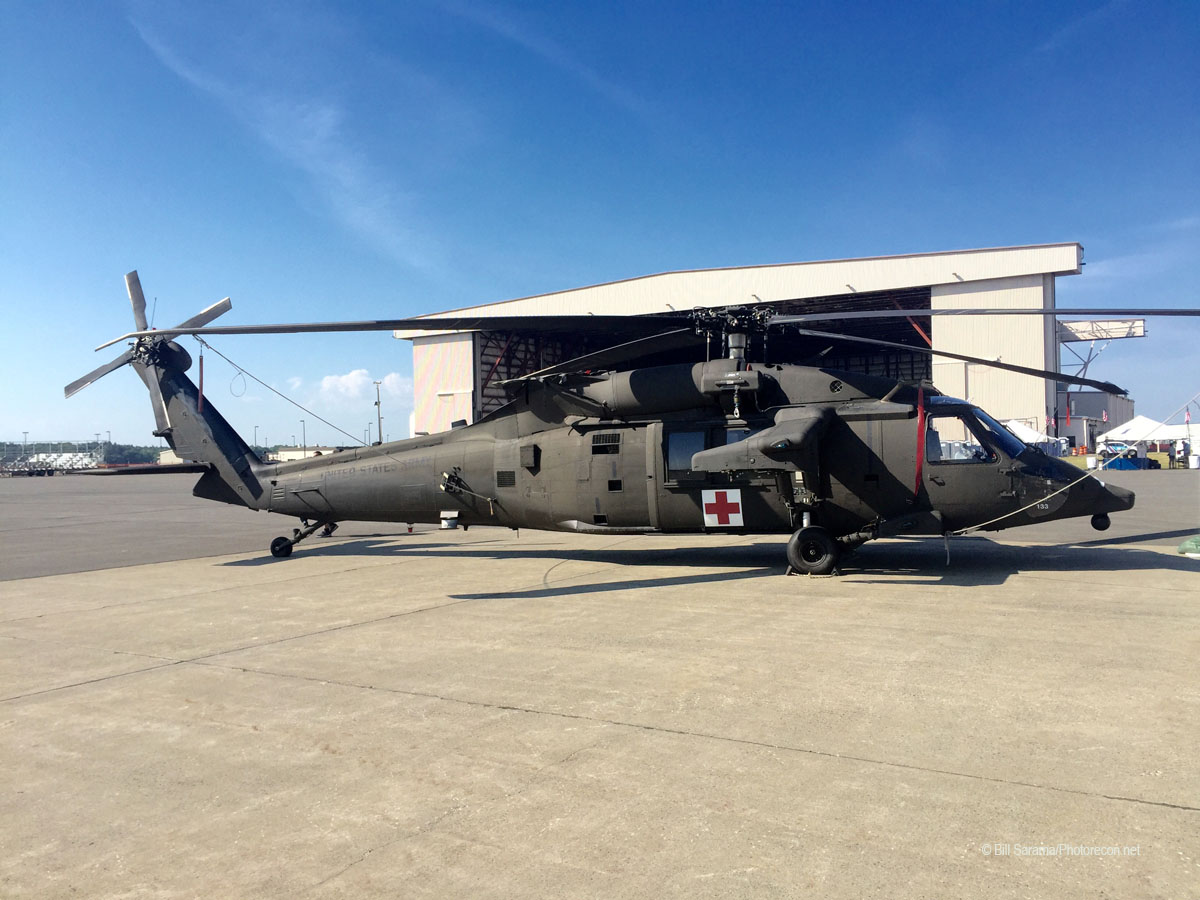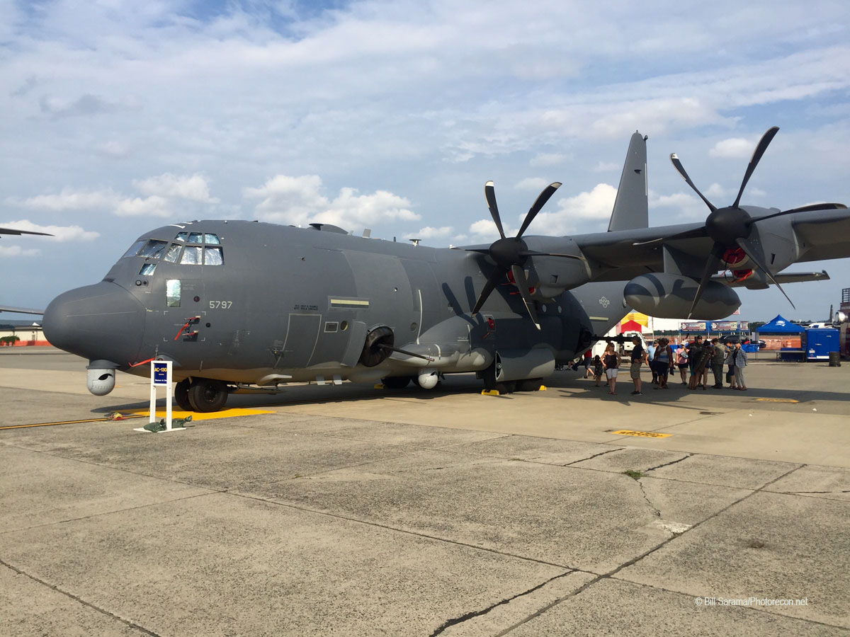 On the public ramp side of the wire were the static aircraft displays: working our way down from the upper north end of the ramp, first we hit a new C-5M Super Galaxy from the 436AW-AMC / 516AW-AFRC out of Dover; next were two F-16C’s from the 20th FW out of Shaw, both loaded up with assorted inert ordinance; next door were three A-10C Hogs from the 190th FS, “Skullbangers”‘ from the ID ANG out of Gowen Field ANGB, Boise, ID; doing traffic duty above the ramp and the parking lots was a Mass, State Police Aviation Unit Eurocopter AS355; back on the ramp, an AC-130J Hercules “Shadow / Ghostrider” Gunship from the 73rd Special Operations Squadron, 1st Sp Ops Wing, SOC, out of Hurlburt Field, FL; next a KC-10A “Extender” tanker from the 305AMW-AMC / 514AMW-AFRC; and two F-16C’s from the 158th FW, VT ANG, “The Green Mountain Boys / Minutemen”, with green tail art and “70th Anniversary 1946-2016” logos out of Burlington ANGB, VT.