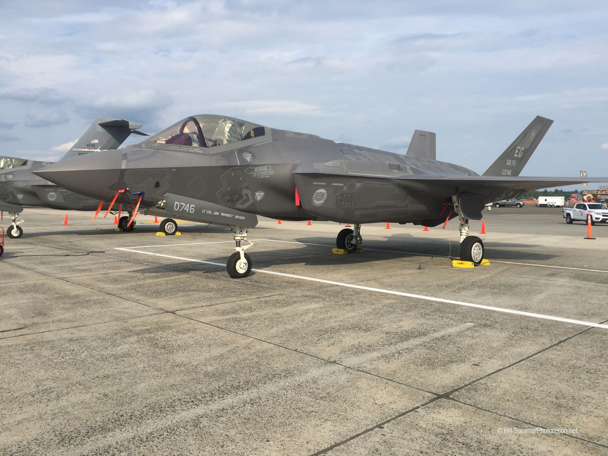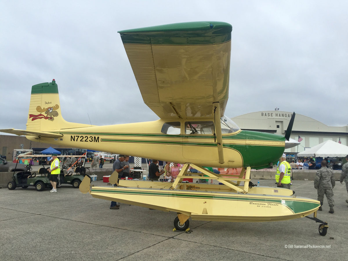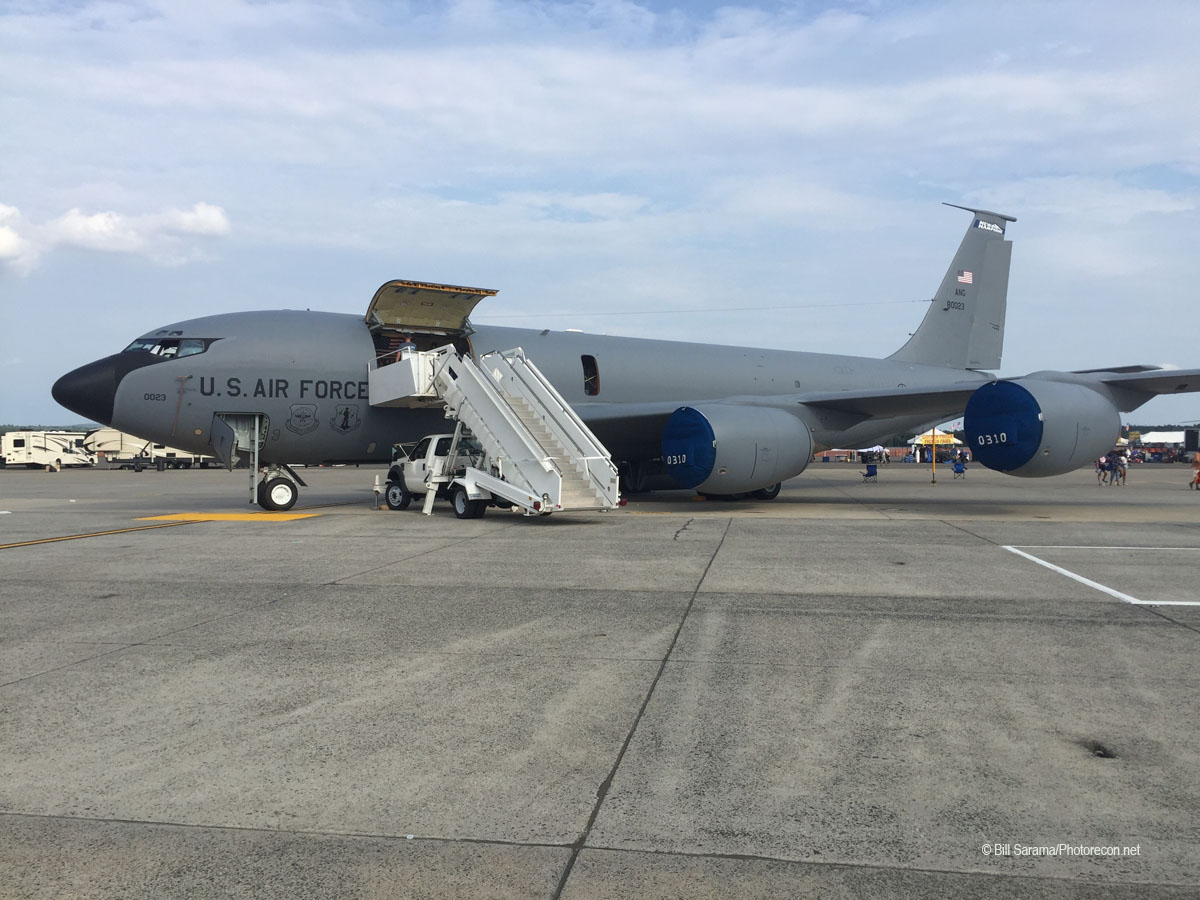 Walking further south on the static ramp we found another cluster of new and current Military birds: a black T-38C Talon from the 509th BW, Global Strike Command, ACC, from Whiteman AFB, (WM) MO, that assists in training B-2A bomber pilots; then another black T-38C Talon from the 71st Fighter Training Squadron “Ironmen” of the 1st FW out of Langley AFB; A CAP 8-passenger GippsAero GA8 AirVan 8; a KC-135R Stratotanker from the 157ARW / 133rd ARS NHANG out of Pease ANGB, NH; two Marine helos from HMLA-269 out of MCAS New River, NC – a UH-1Y “Yankee” Venom (Twin Huey) utility helo with rocket pods and a AH-1W “Whiskey” Super Cobra Attack Helo: a 300 year old B-52H heavy bomber from the 307th Bomb Wing, 93rd Bomb (Training) Squadron, FTU, AF Global Strike Command, Barksdale AFB, LA, “BD” tail, with “Hawgwild” nose art with a charging Wild Boar Pig (with an A-10 “Hog” in the dust); a T-6A Texan II from the 41st FTS, out of Columbus AFB (CB), OH; a white Raytheon Hawker Beechcraft T-1A “Jayhawk” (Beech T-400A) with Tuskegee Airmen nose art and a red tail band from the 99FTS /AETC out of Randolf AFB (RA), TX; a C-130 Hercules from the 910th AW, AFRC, Youngstown ARB, OH; a C-17A from the 445th AW, AFRC, Wright-Patterson AFB, OH; two Navy grey wings out of Chambers Field, NAS Norfolk, VA – an E-2C 8-blade Hawkeye from VAW-120 “Greyhawks” and a C-2A Greyhound also from VAW-120 (since they are a training squadron they use both the C-2A and the E-2C in VAW-120); the “Pie’ce de R’esistance” of the air show – two brand new Lockheed-Martin USAF F-35A Lightning II all-weather stealth multi-role conventional takeoff and landing (CTOL) fighters from the 58th FS / 33rd FW, out of Eglin, AFB, FL (non-flying) and roped off with heavy security all locked and loaded; even the Army was here – an AH-64 (no unit ID); a VIP gloss blue Bell UH-1N Twin Huey from the 11th Wing, out of JB Andrews, DC; a beautiful white with a red band USCG EDADS HC-144A “Ocean Sentry” twin-engined medium range SAR aircraft, based on the AIrbus (CASA/IPTN) CN-235 design, out of USCGAS Cape Cod;