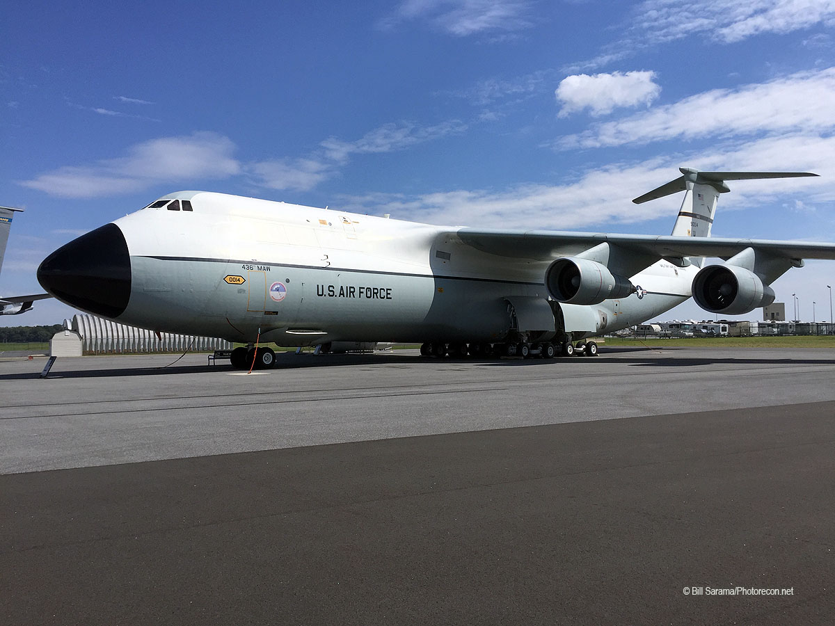 Finally at 10:00 M, after the Breakfast was finished, and the last coffee was poured and all the dignitaries made their final speeches, the small stage was quickly dismantled and then quite dramatically, the large hanger doors of the giant Fuel Cell Hanger were opened to reveal a new C-5M “Super Galaxy” parked close to the hanger with an area roped off with orange fencing around the aircraft. There was a short naming ceremony for the dedication of the “Spirit of Chicopee”, the first upgraded C-5M to arrive at the base in January. The 439AW will convert all 8 of their C-5 Galaxies to be C-5M “Super Galaxies” to be completed later this year. The C-5M is a re-engined version of the US Military’s largest aircraft. Along with being quieter, the new General Electric CF6-80C2-L1F (F-138-GE-100) turbofan commercial engines are more efficient and provide 22% more thrust. The C-5M will also have an all-digital “glass cockpit” with mostly digital displays. After the dedication speeches, the “Golden Knights” jumped from their US Army C-31A “Troopship” jump plane (a version of a Fokker F27 Friendship airliner) from 12,500 feet in free-fall, opening at 7,500 with smoke canisters first with a single jumper flying the POW / MIA flag and next with the full team doing a Starburst free fall with smoke, all landing in sequence exactly hitting the “T” target placed between the wing and the tail of the C-5M. After unhooking their chutes, the Team Leader, Sgt. Teigh Statler, gave the team transfer baton to USAF veteran Joe Caputo, of South Hadley, who, in 1955, was a C-124 “Globemaster II” crew member stationed here at Westover AFB. Once the chutes were all tucked way, the orange fencing was partially opened to allow the 600 VIP guests access to see the C-5M up close and board the cabin with the ramps and clam shell doors opened. The Static Ramp remained closed all day Friday for positioning arriving aircraft.