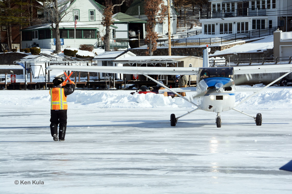 The aircraft parking area is accessible on foot from the automobile parking lots nearby. No persons except air crew and passengers, along with up to four parking volunteers, are allowed in the parking area and runway. New Hampshire rules reinforce anti-COVID-19 social distancing measures this year too. A steady stream of walking spectators, snowmobilers and ice fisher-people are able to travel around the aircraft parking area though, and the landing restriction into the cove from the south gives one a rather unique perspective as aircraft are a few hundred feet from touchdown abeam of the parking area.