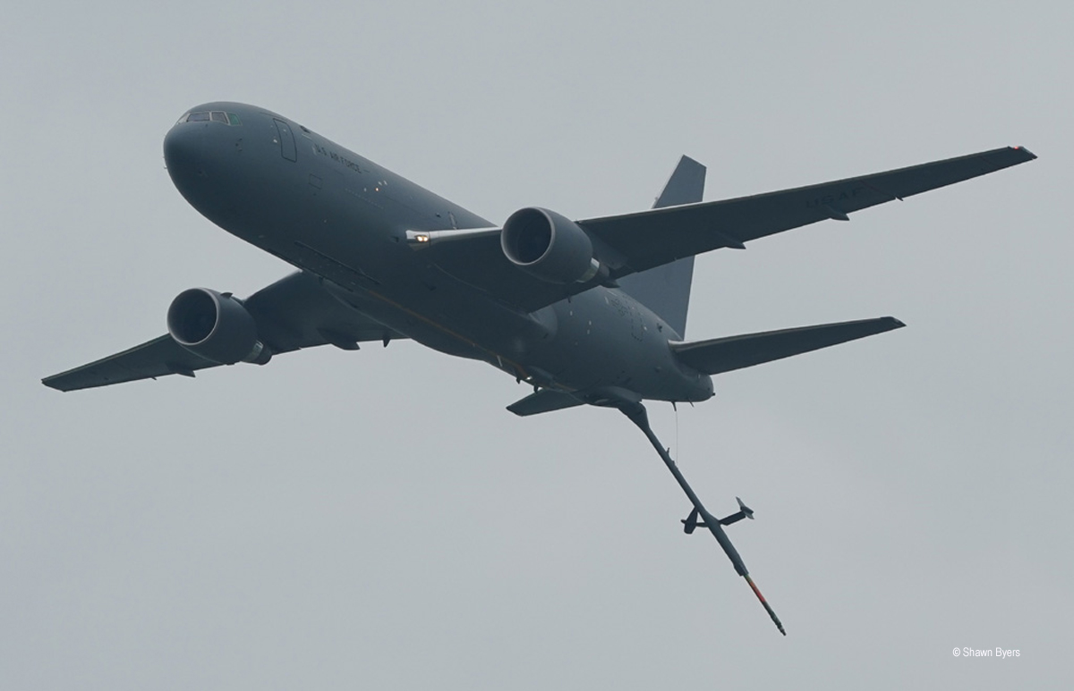 The KC-46 missed a number of opportunities to fly due to the weather. It launched to make a single pass by the crowd with the boom deployed. It did not play a role in the combined arms demo although it would have been cool to see a simulated inflight refueling pass.